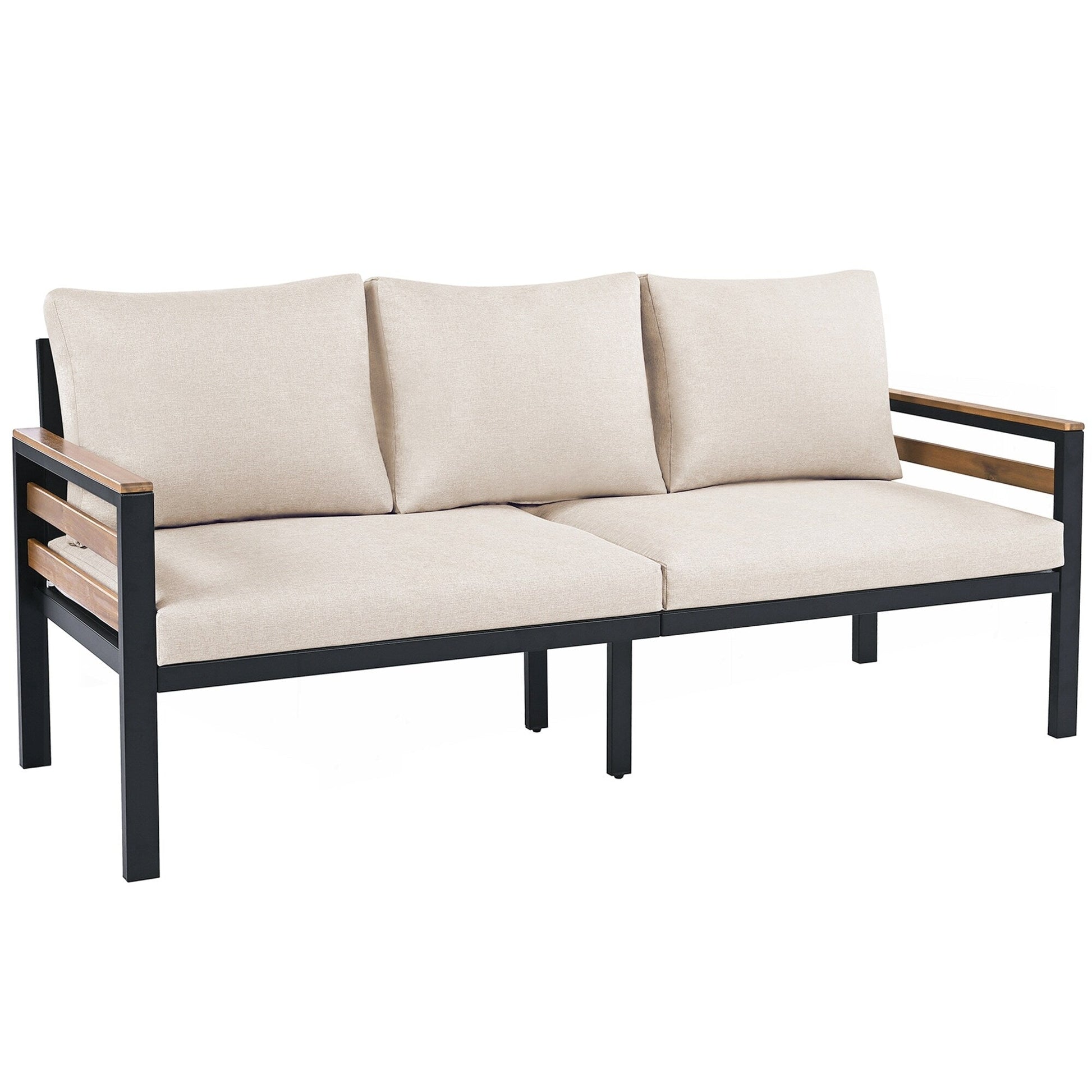 L'ensemble complet comprend : 1 canapé trois places (53,96 lb) 2 fauteuils (26,43 lb chacun) 1 table en bois d'acacia (18,28 lb)
