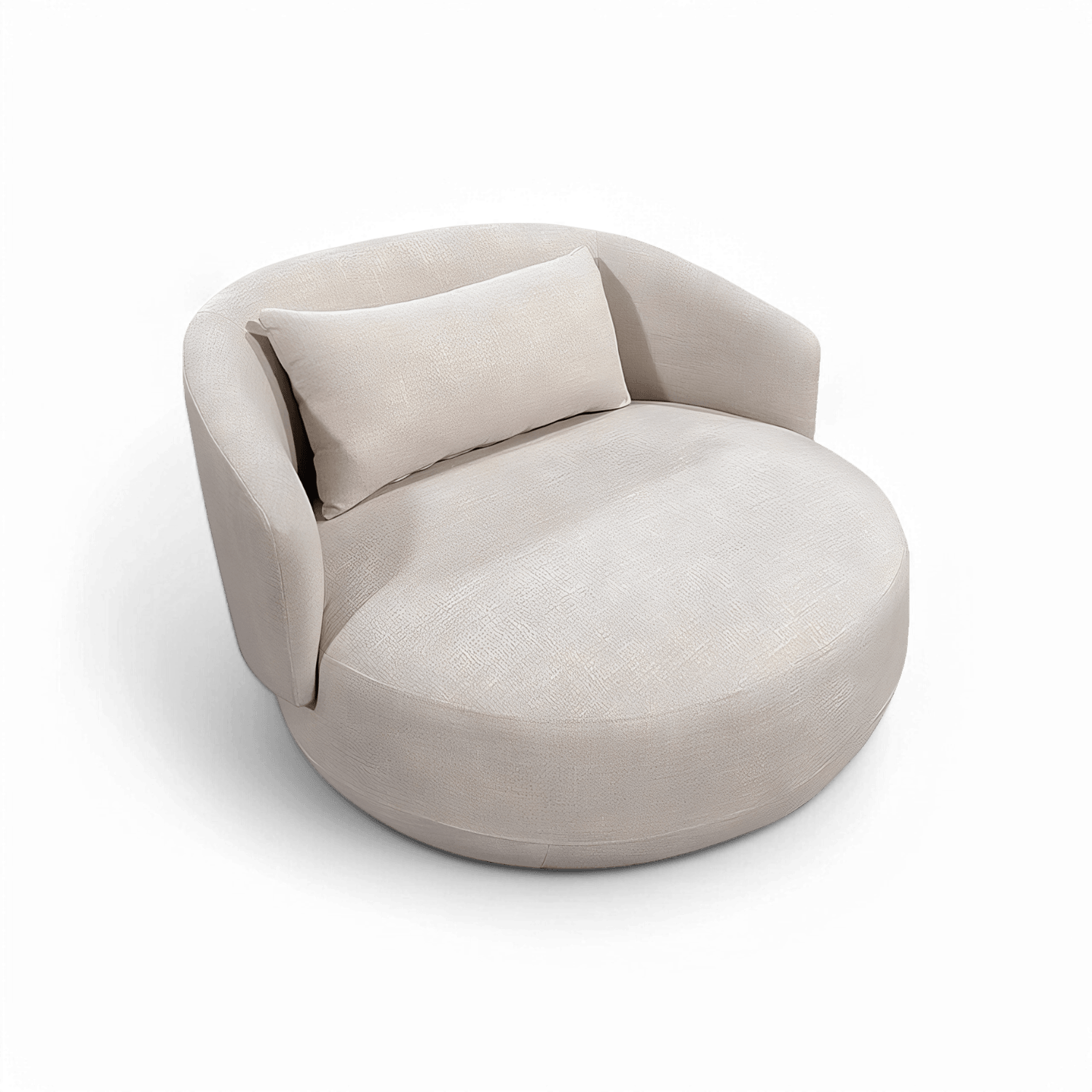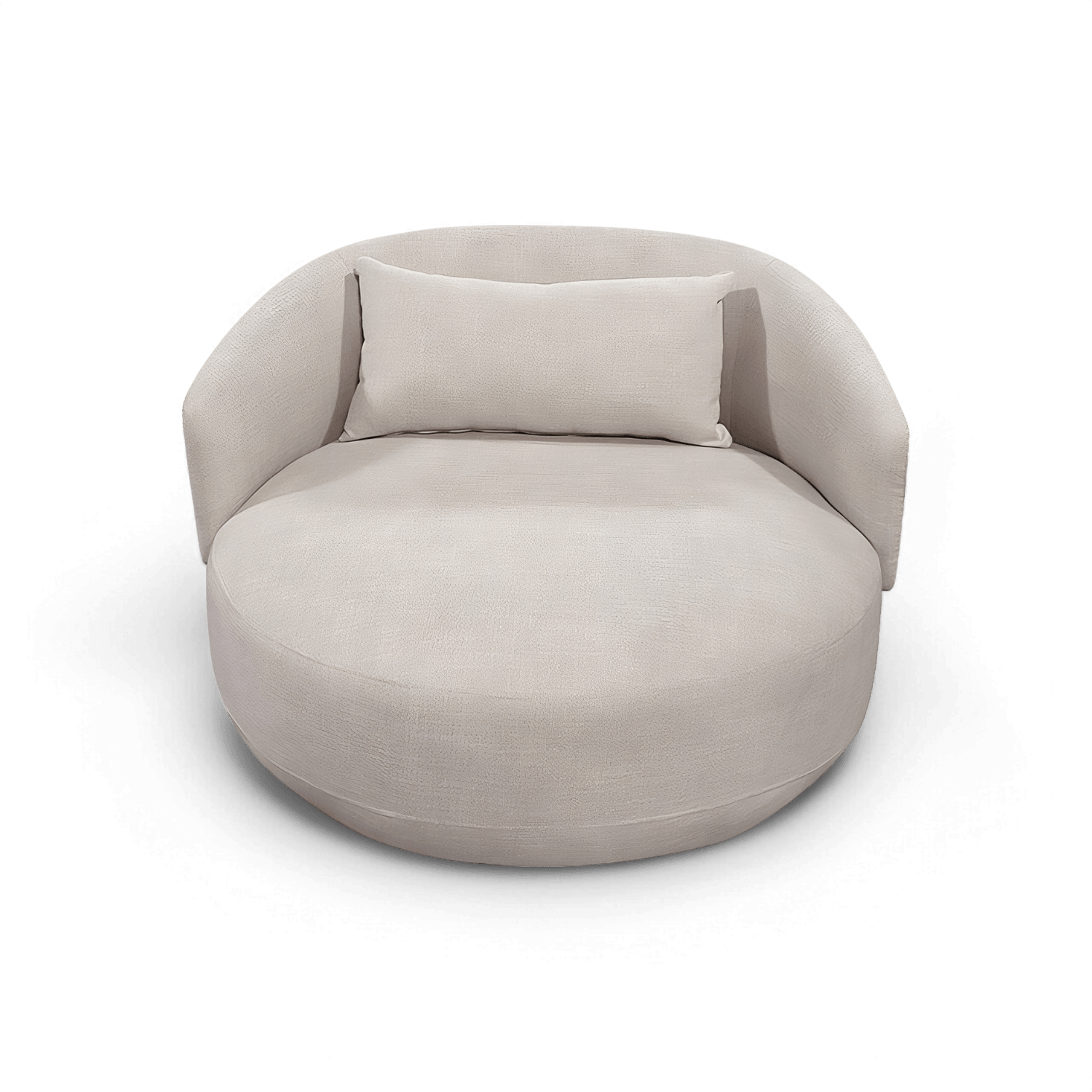 Pivotant à 360° | Un coussin inclus | Revêtement : Tissu 100 % polyester | Rembourrage : Mousse et fibres synthétiques | Structure intérieure : Bois massif et contreplaqué | Suspension : Sangles d'assise et de dossier et ressorts à arc | Capacité de charge : 350 lb