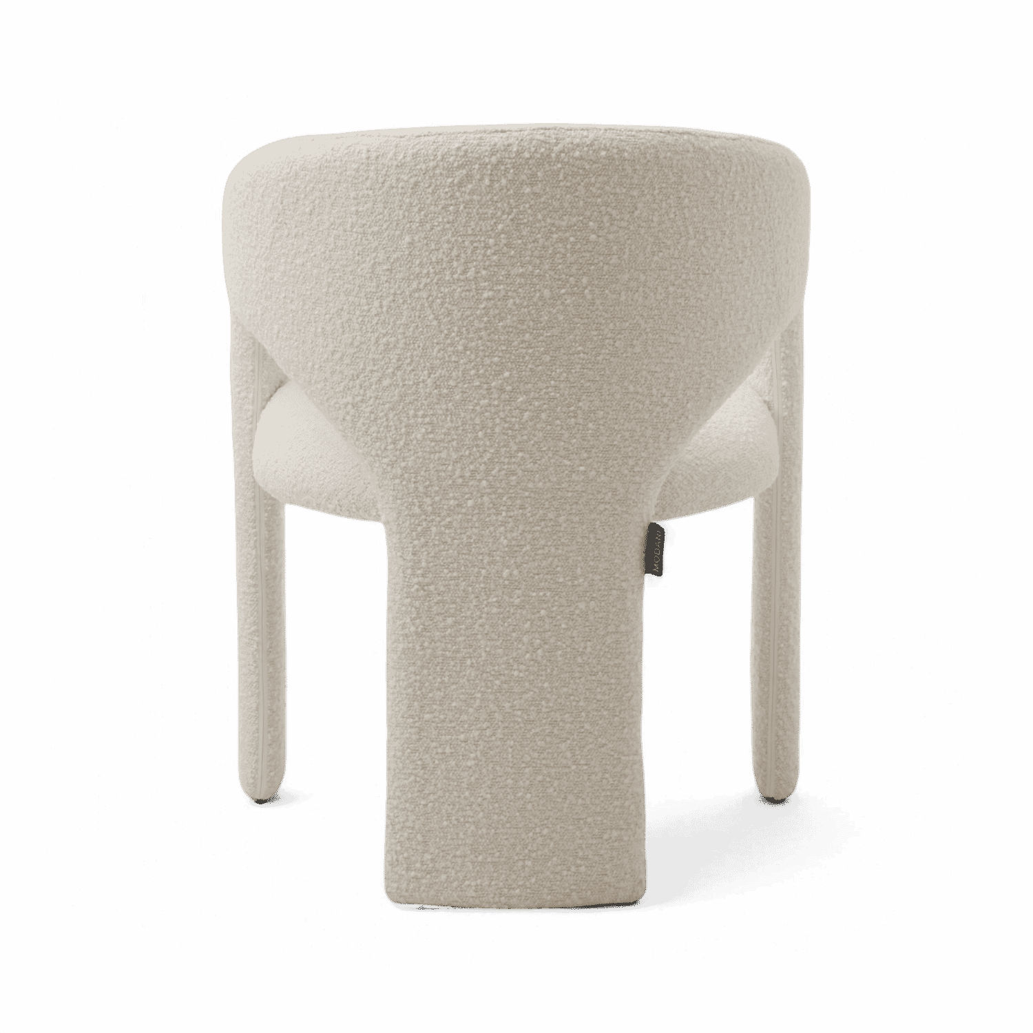La chaise de salle à manger Aria est une pièce élégante et moderne alliant design contemporain et élégance fonctionnelle. Son dossier arrondi épouse parfaitement la silhouette, offrant confort et style. Dotée de trois pieds subtilement fuselés, elle arbore une silhouette audacieuse et un pied arrière plus large pour une stabilité accrue. L'ensemble est luxueusement recouvert d'un riche tissu bouclé ivoire, offrant une surface douce et texturée qui rehausse son élégance. Idéale pour les salles à manger ou comme siège d'appoint, la chaise de salle à manger Aria incarne le charme minimaliste et le raffinement artisanal.