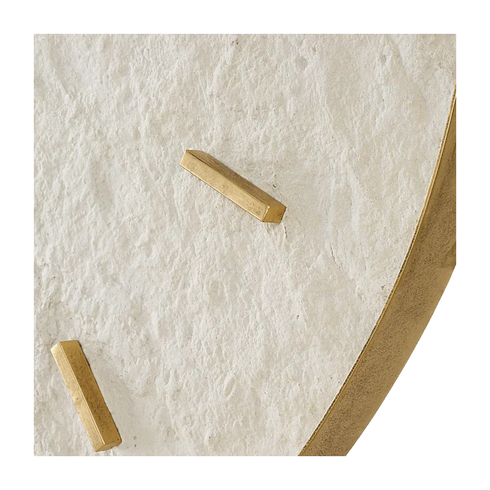 L'horloge Antelier est une pièce remarquable et élégante, au design minimaliste et au cadran blanc cassé texturé qui respire la sophistication. Encadrée d'un élégant cadre doré, cette grande horloge murale d'un diamètre d'un peu plus de 89 cm s'intègre parfaitement à tout intérieur moderne.