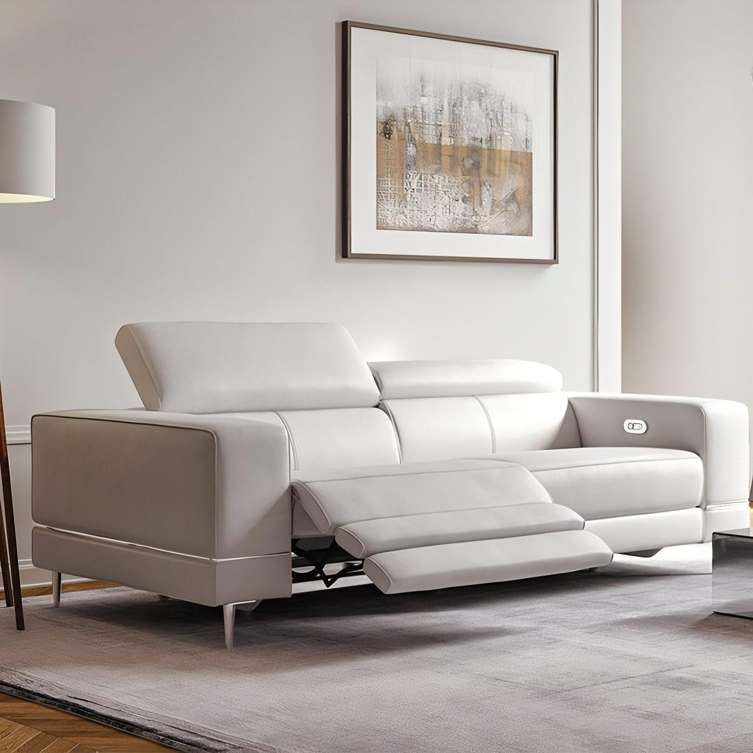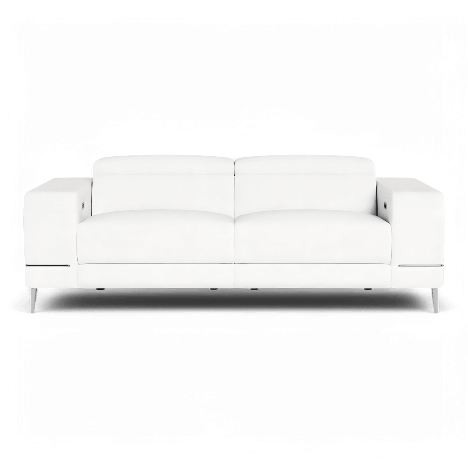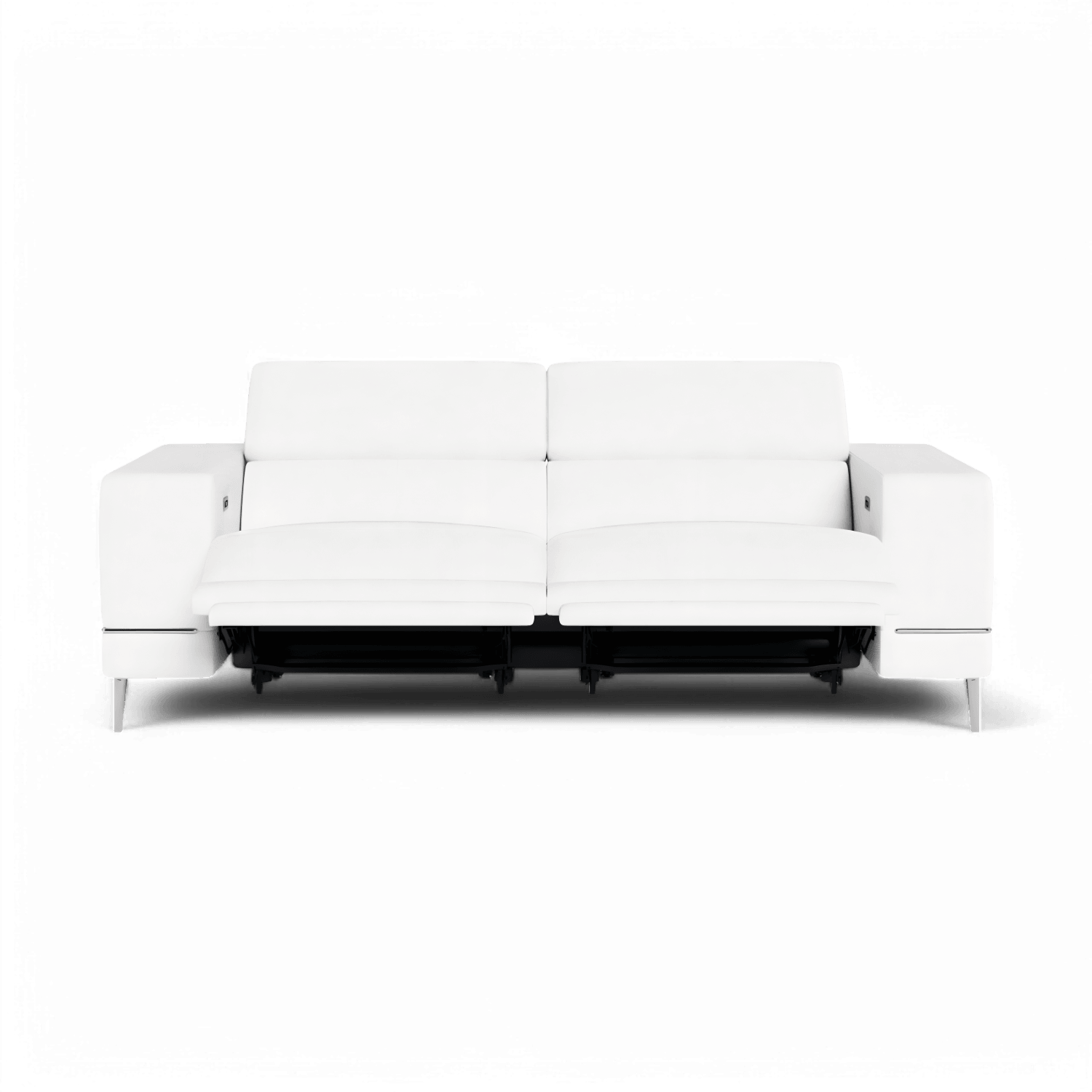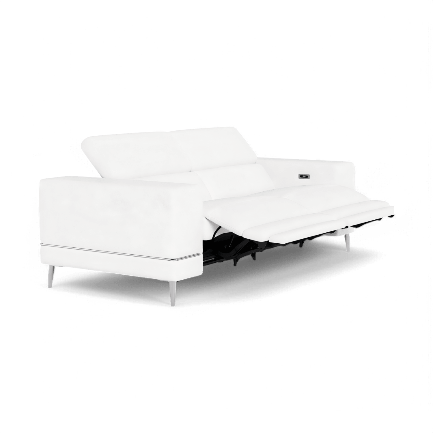 Plongez dans un état de détente absolue avec le canapé Bergamo Motion blanc. Revêtu de cuir souple et d'une mousse enveloppante, ce canapé design est doté d'appuie-têtes et de repose-jambes mobiles pour un confort optimal. Ses pieds en métal assurent la stabilité tout en offrant la hauteur nécessaire. Pour s'incliner, il suffit d'appuyer sur le bouton situé à l'intérieur de l'accoudoir. Également disponible en gris foncé.