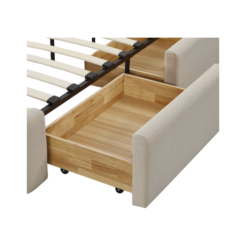 Le lit Capri King Size couleur crème est un ajout luxueux et moderne à toute chambre, avec son design élégant et capitonné dans une douce finition crème. Ce lit est doté d'une tête de lit haute et incurvée pour plus de confort et d'élégance, ainsi que de tiroirs de rangement intégrés de chaque côté, offrant des solutions pratiques pour un gain de place.