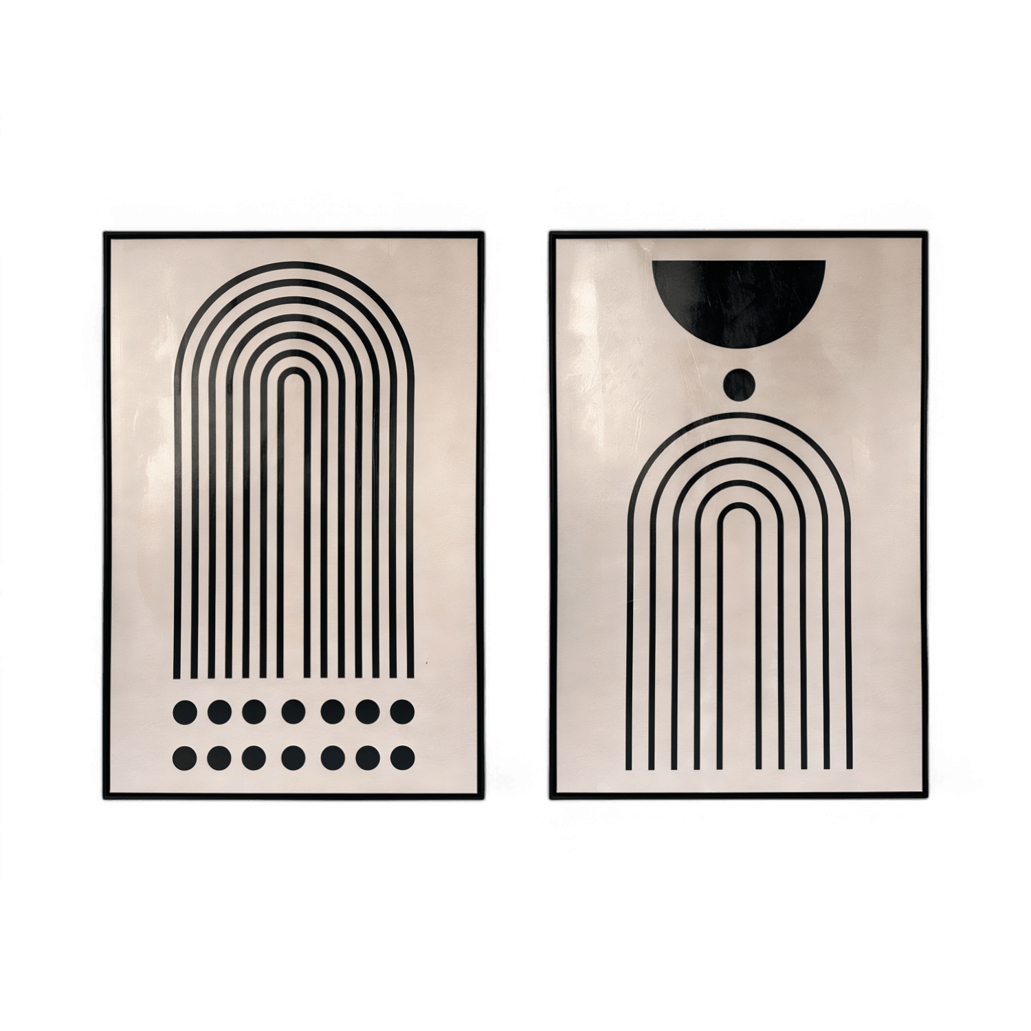 L'œuvre murale Gentle Contours est une œuvre sophistiquée composée de deux pièces, incarnant le minimalisme avec une touche chaleureuse et organique. Sur un fond beige neutre, chaque pièce présente des motifs noirs en forme d'arche, fluides et gracieux. Dans l'une des pièces, des cercles noirs pleins se nichent sous l'arche, créant un élément rythmique et apaisant. Dans l'autre pièce, un demi-cercle noir surplombe l'arche, accompagné d'un petit cercle complet, créant une impression de mouvement ascendant et d'équilibre. Ensemble, ces pièces évoquent l'harmonie et la curiosité par leurs agencements contrastés, apportant une touche moderne et apaisante à tout environnement.