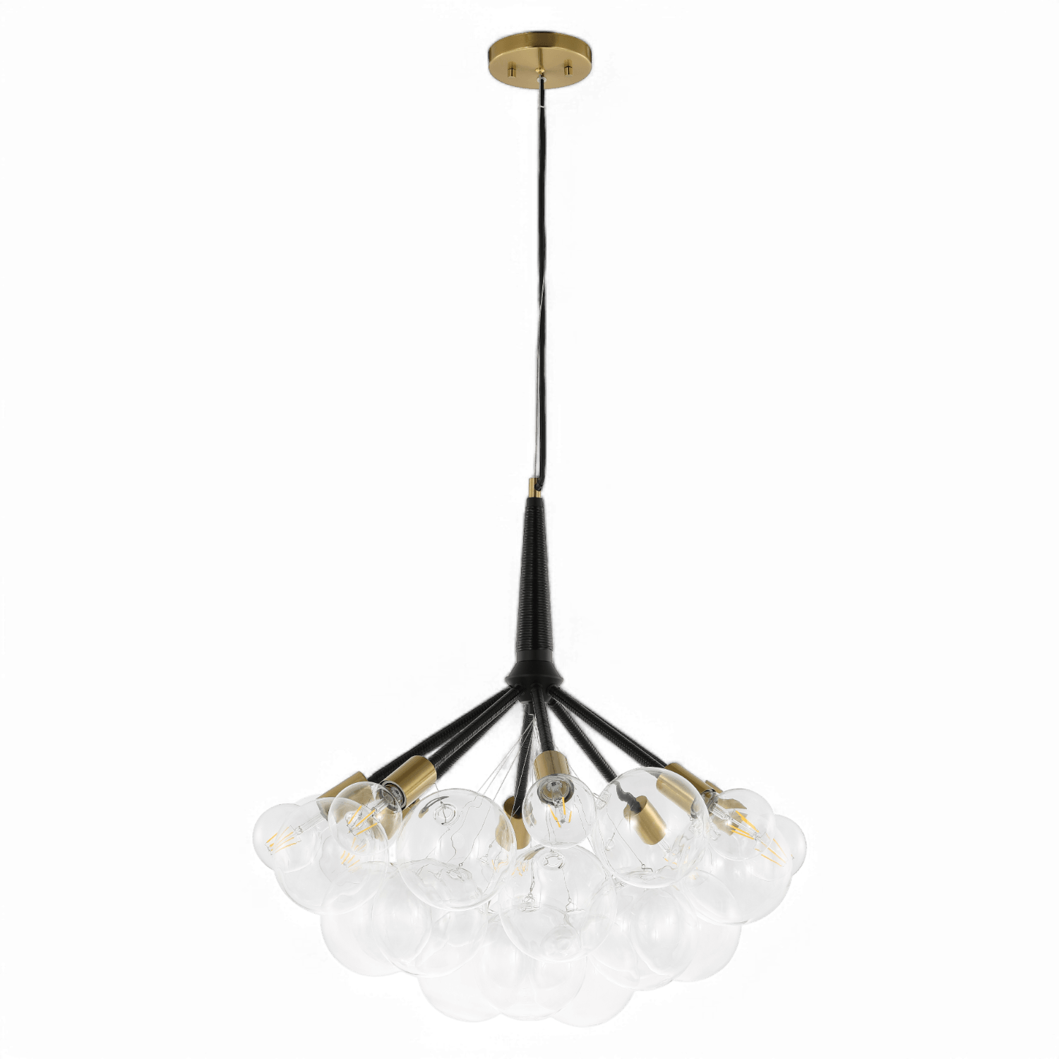 Le lustre Haze est un luminaire moderne et captivant qui respire l'élégance avec ses boules de verre transparent. Suspendu à un cordon noir réglable en hauteur, il est orné d'élégants détails en laiton qui lui confèrent une touche de sophistication. Parfait pour les espaces contemporains, ce lustre crée un effet nuageux envoûtant, alliant style et polyvalence.