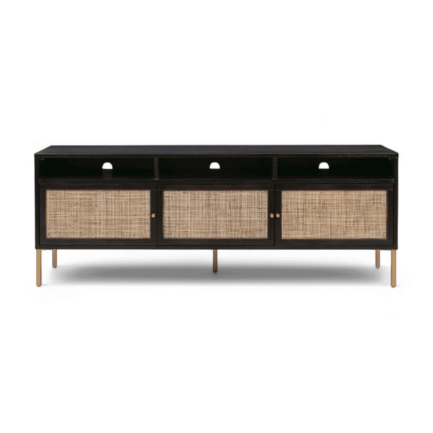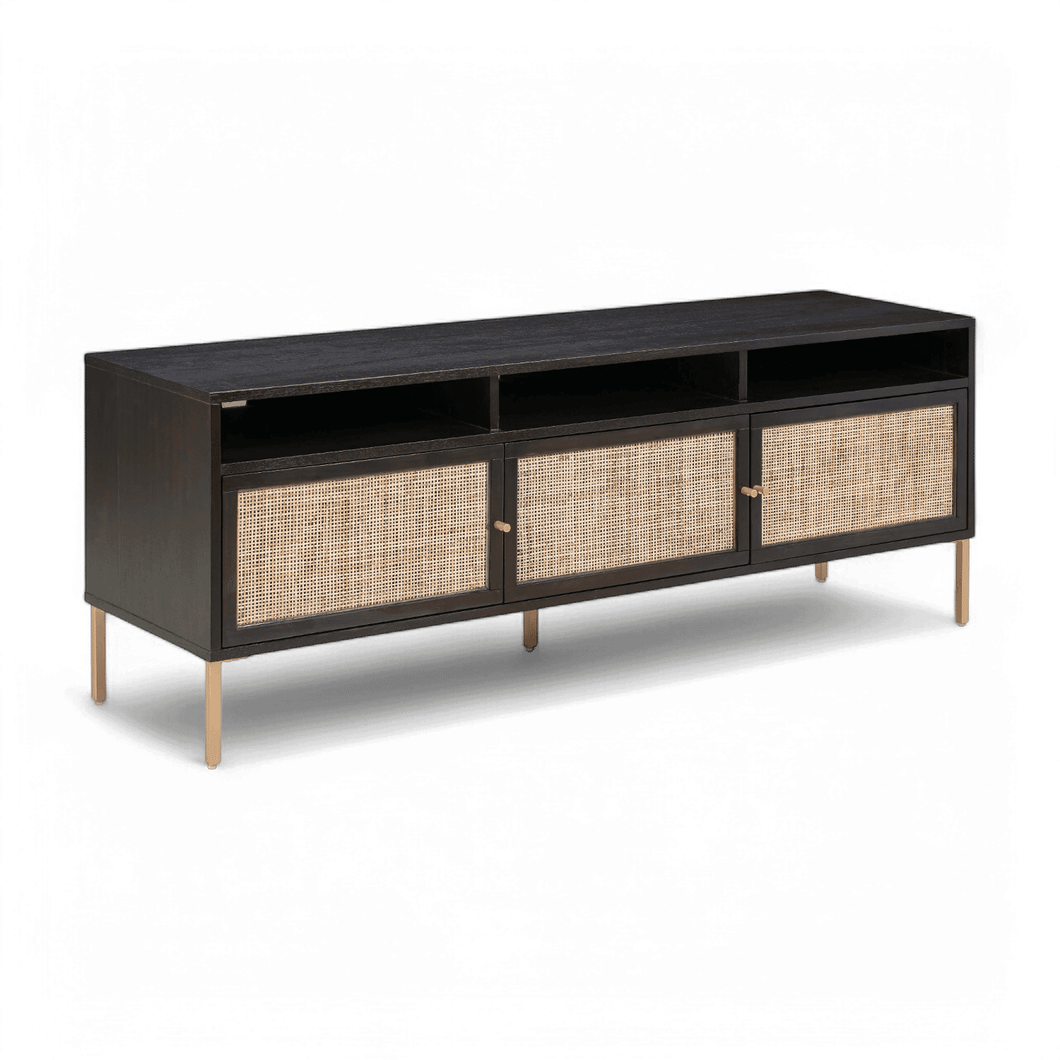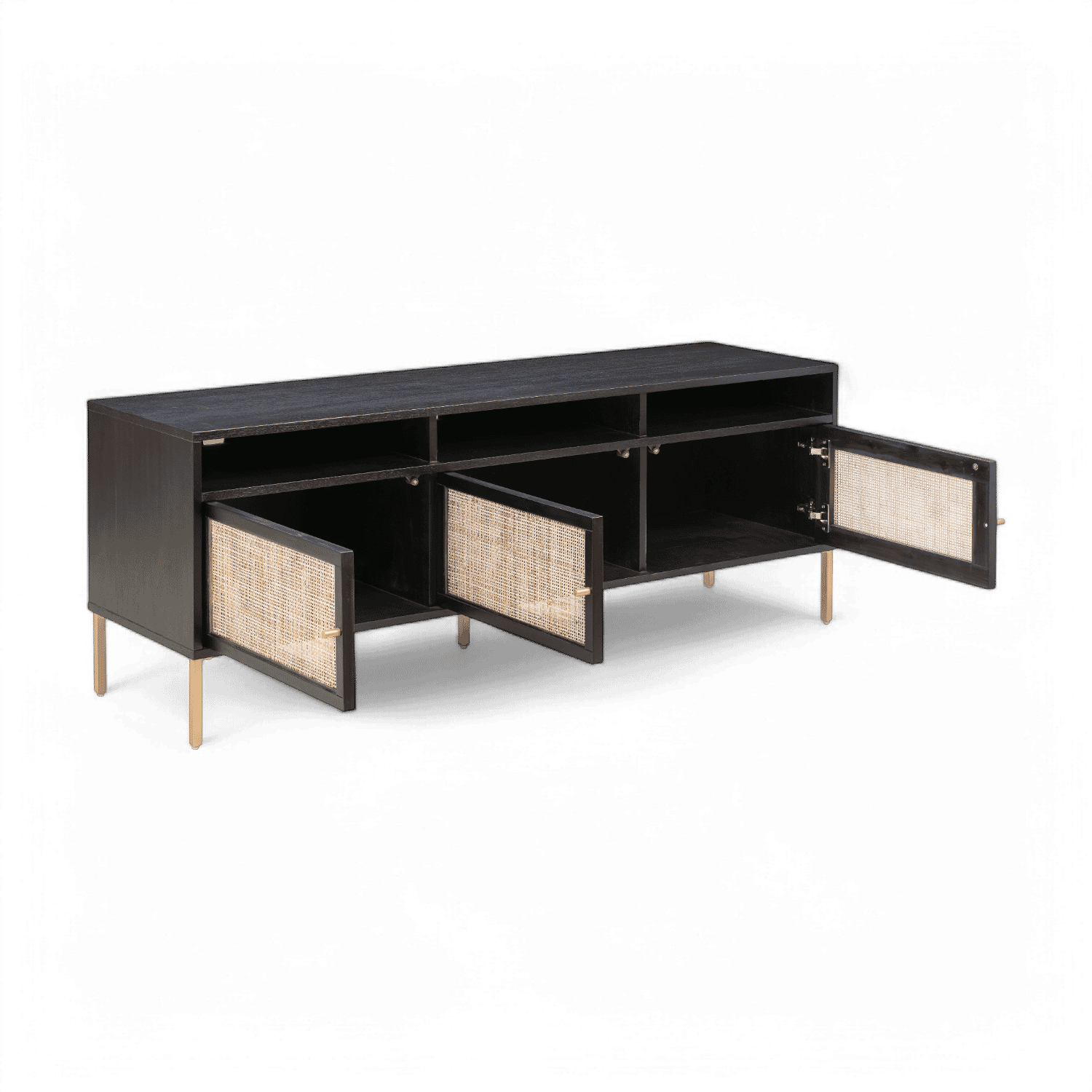 Acacia, MDF, rotin | Disponible en deux coloris | Offre de nombreux rangements grâce à trois armoires à fermeture douce | Dimensions de l'armoire : 20,4 pi L x 16,8 pi P x 11 pi H