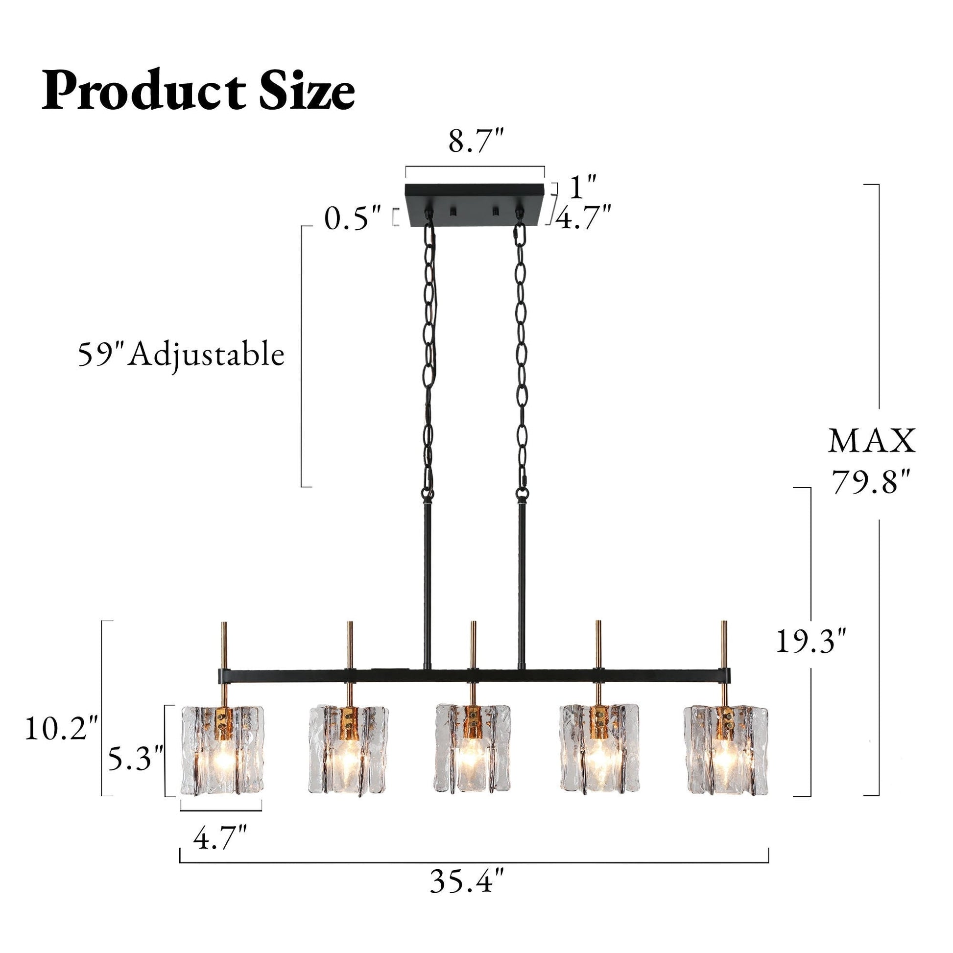 Lustre linéaire moderne Kasy à 5 lumières en verre texturé pour îlot de cuisine, design unique