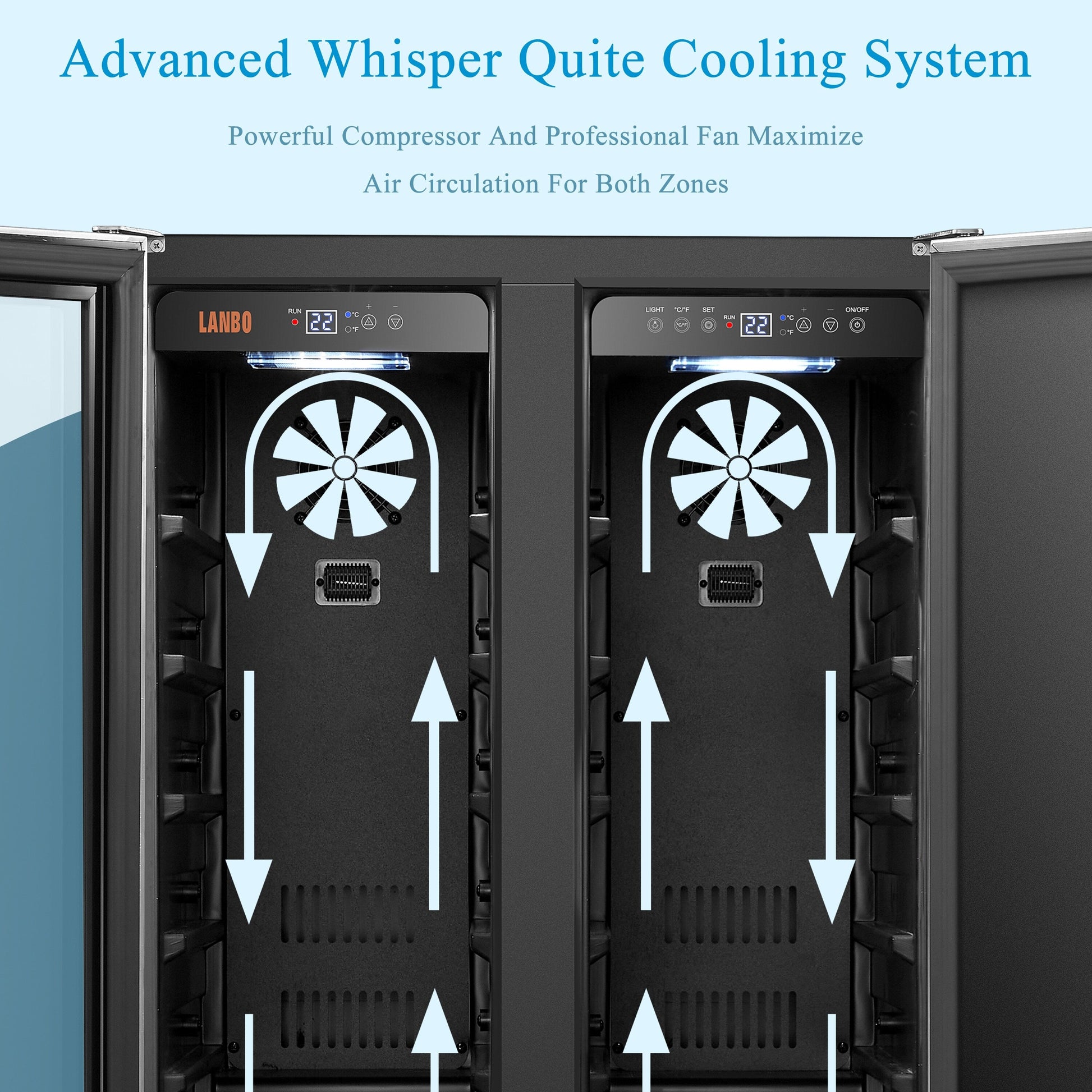 Réfrigérateur Lanbo 24 pouces à double zone, 18 bouteilles de vin et 55 canettes de boissons, en acier inoxydable et verre, avec porte française