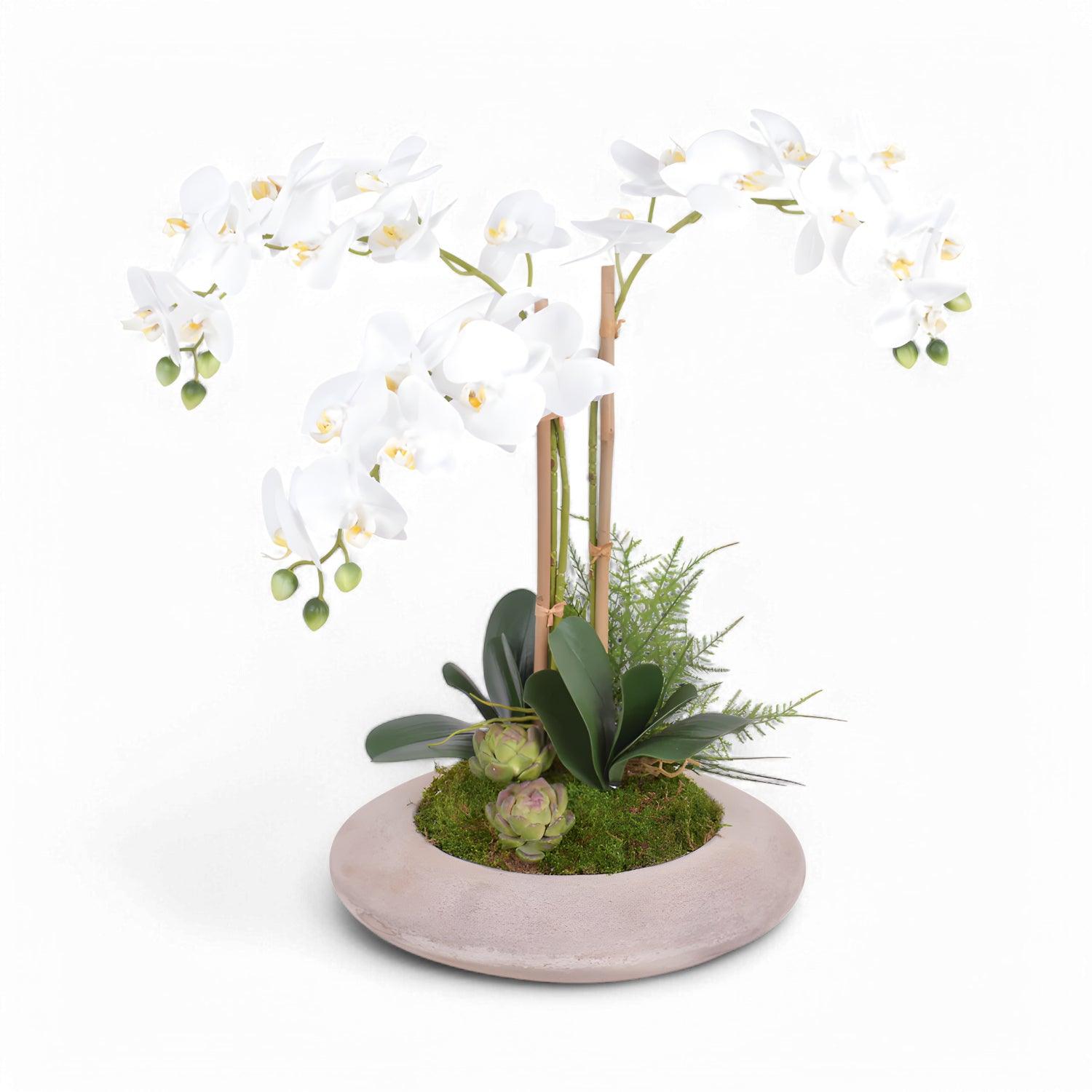 Sublimez votre espace avec la composition florale « Lettres ». Cette magnifique composition florale réaliste de 55 cm, composée d'orchidées blanches en cascade élégante, dégage une beauté intemporelle. Soigneusement disposée sur un socle rond minimaliste effet pierre, elle est rehaussée d'un feuillage vert luxuriant, de mousse éclatante et de deux charmantes plantes grasses pour une touche naturelle et rafraîchissante.