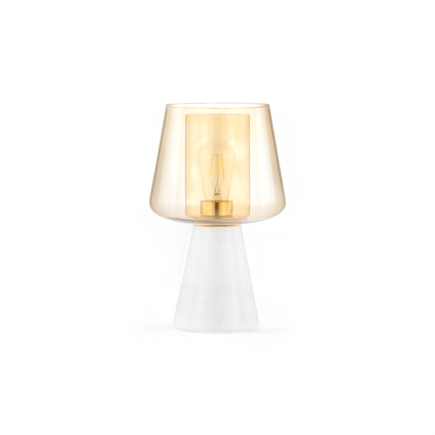 La lampe de table Liora, coloris blanc et ambre, allie avec brio simplicité moderne et élégance chaleureuse. D'une hauteur de 35,5 cm, elle présente une base blanche élégante à la silhouette effilée et lisse. Un superbe abat-jour en verre ambré couronne la base, offrant une riche teinte dorée contrastant avec le blanc. La teinte ambrée de l'abat-jour apporte une touche de charme vintage, faisant de la lampe de table Liora une pièce polyvalente qui s'intègre aussi bien dans les styles de décoration modernes qu'éclectiques.