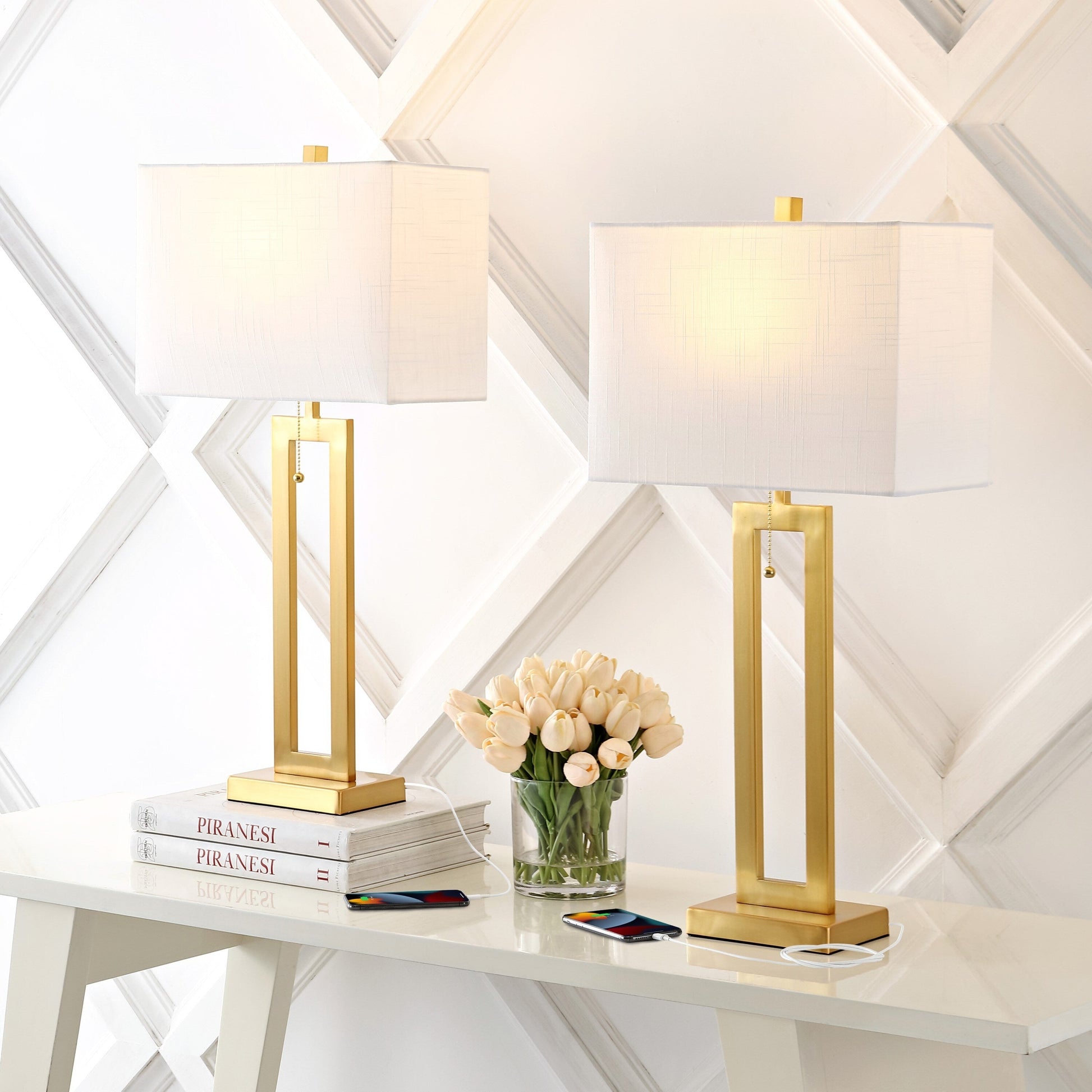 Une finition métallique élégante et des abat-jour carrés en lin confèrent à cette paire de lampes un style épuré et moderne. Parfaites pour les intérieurs de complexes hôteliers et de bureaux, chaque lampe est équipée d'un port USB et d'une ampoule LED pour une lumière vive et chaleureuse. Utilisez ces lampes géométriques pour apporter une touche de sobriété à une chambre, un salon ou une entrée.