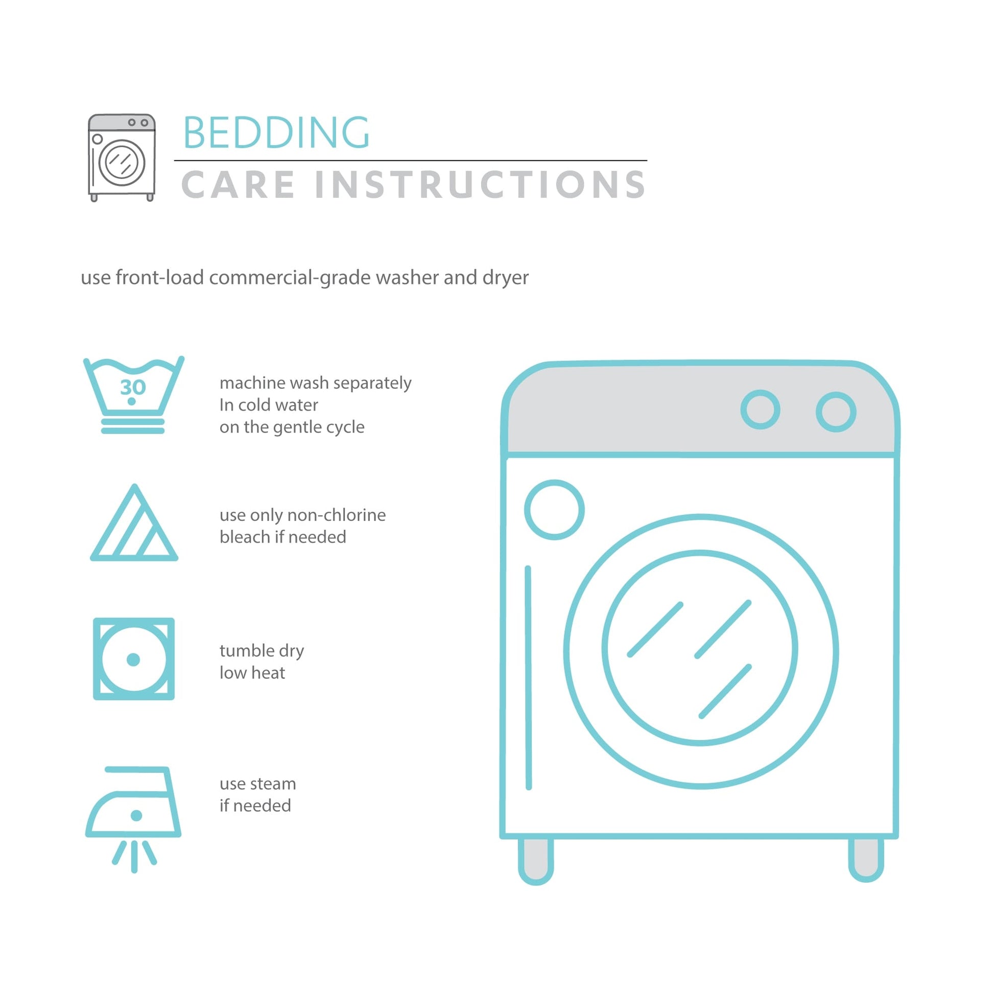 - Utiliser un lave-linge et un sèche-linge à chargement frontal de qualité professionnelle. Laver séparément en machine à l'eau froide, cycle délicat. Utiliser uniquement de l'eau de Javel sans chlore si nécessaire.