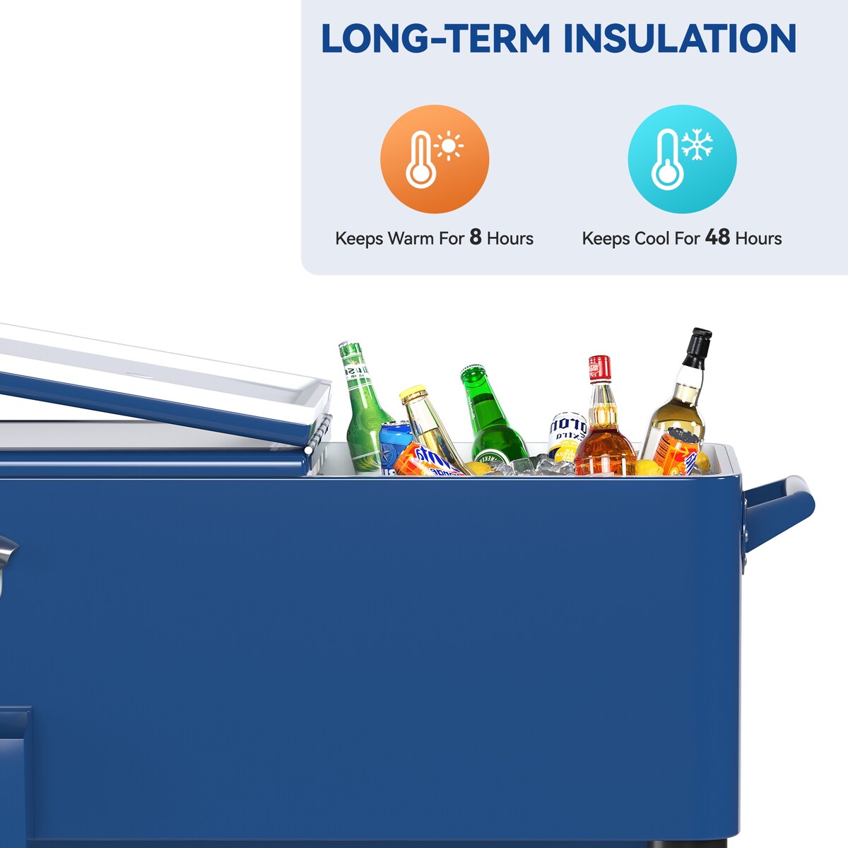 Sublimez vos réceptions en plein air avec notre glacière de terrasse de 80 litres. Elle offre une grande capacité de stockage pour conserver plus de 100 canettes ou plus de 55 bouteilles au frais jusqu'à 48 heures ou au chaud jusqu'à 8 heures. Pratique, cette glacière portable est équipée de roues pivotantes à 360°, de poignées ergonomiques et d'un espace de rangement supplémentaire pour une expérience de rafraîchissement ou de réchauffement en extérieur optimale. Elle peut contenir plus de 100 canettes ou plus de 55 bouteilles, conservant vos boissons au frais jusqu'à 48 heures ou au chaud jusqu'à 8 heures. Idéale pour les rassemblements ou événements en plein air, elle vous garantit un large choix de boissons à portée de main. Facile à transporter, elle se monte et se démonte facilement pour un transport pratique. Emportez-la sans effort pour vos pique-niques, vos sorties en camping ou toute autre aventure en plein air. Dotée de roues pivotantes à 360° et verrouillables, cette glacière d'extérieur est maniable dans toutes les directions. Transportez facilement votre glacière d'un endroit à un autre, que ce soit pour une fête dans votre jardin ou pour un séjour en camping. Conçue pour un confort optimal, cette glacière sur pied est équipée de poignées robustes et ergonomiques de chaque côté, pour une mobilité optimale et un transport aisé. Le plateau inférieur de la glacière portable offre un espace de rangement supplémentaire, vous permettant de transporter un maximum d'articles. De plus, un décapsuleur intégré avec récupérateur de capsules sur le côté facilite l'ouverture des bouteilles et la récupération des capsules.