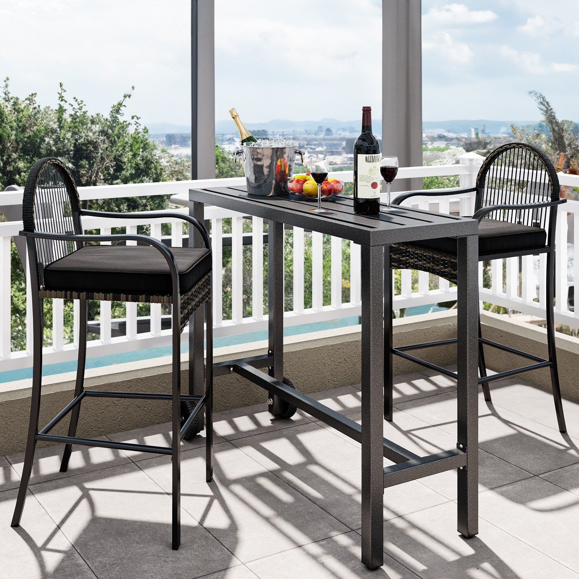 Notre table de bar d'extérieur est un ajout élégant et robuste à votre espace extérieur. Fabriquée en métal de haute qualité avec une finition thermolaquée, elle est durable et robuste. Sa capacité de charge de 120 kg lui permet de supporter sans effort de lourdes charges. De plus, ses roulettes latérales facilitent son déplacement et son repositionnement.