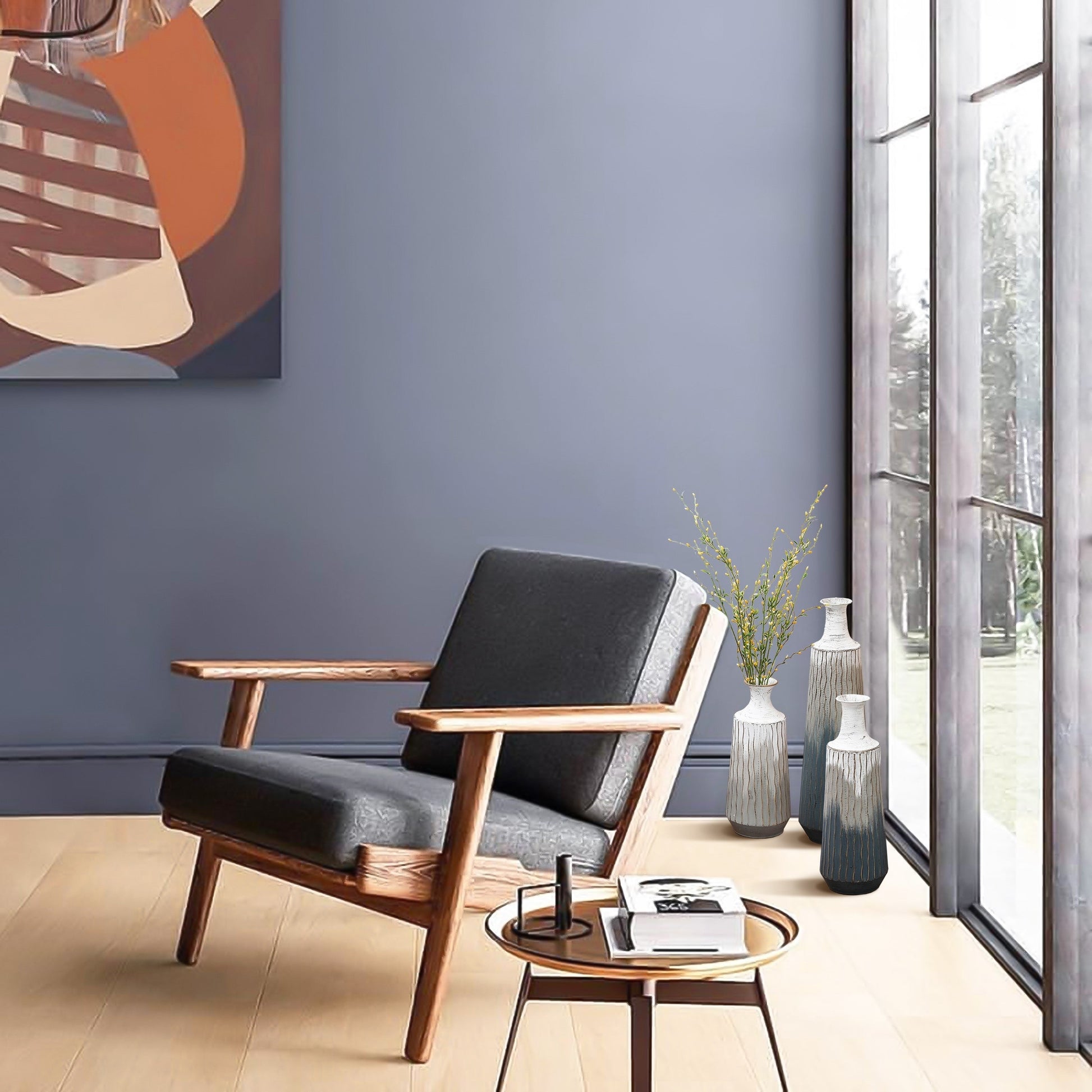 Ajoutez une touche d'élégance moderne à votre décoration avec cet ensemble de trois vases bouteilles en métal fabriqués à la main. Arborant un magnifique motif dégradé bleu, gris et blanc, rehaussé de touches dorées, ces vases s'intègrent parfaitement à n'importe quelle pièce. Leur forme fuselée et leur ouverture cannelée en forme de bouton apportent une touche unique à votre décoration, qu'elle soit posée au sol ou sur une table. Ces vases sont parfaits pour présenter des fleurs séchées ou artificielles et sont disponibles en trois tailles différentes pour un ensemble complet. Que vous les disposiez ensemble ou séparément, ils apporteront profondeur et hauteur à votre décoration.