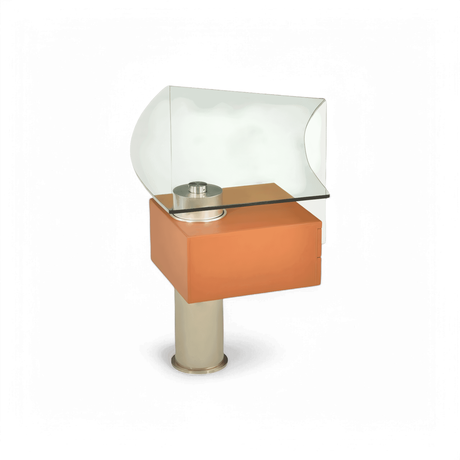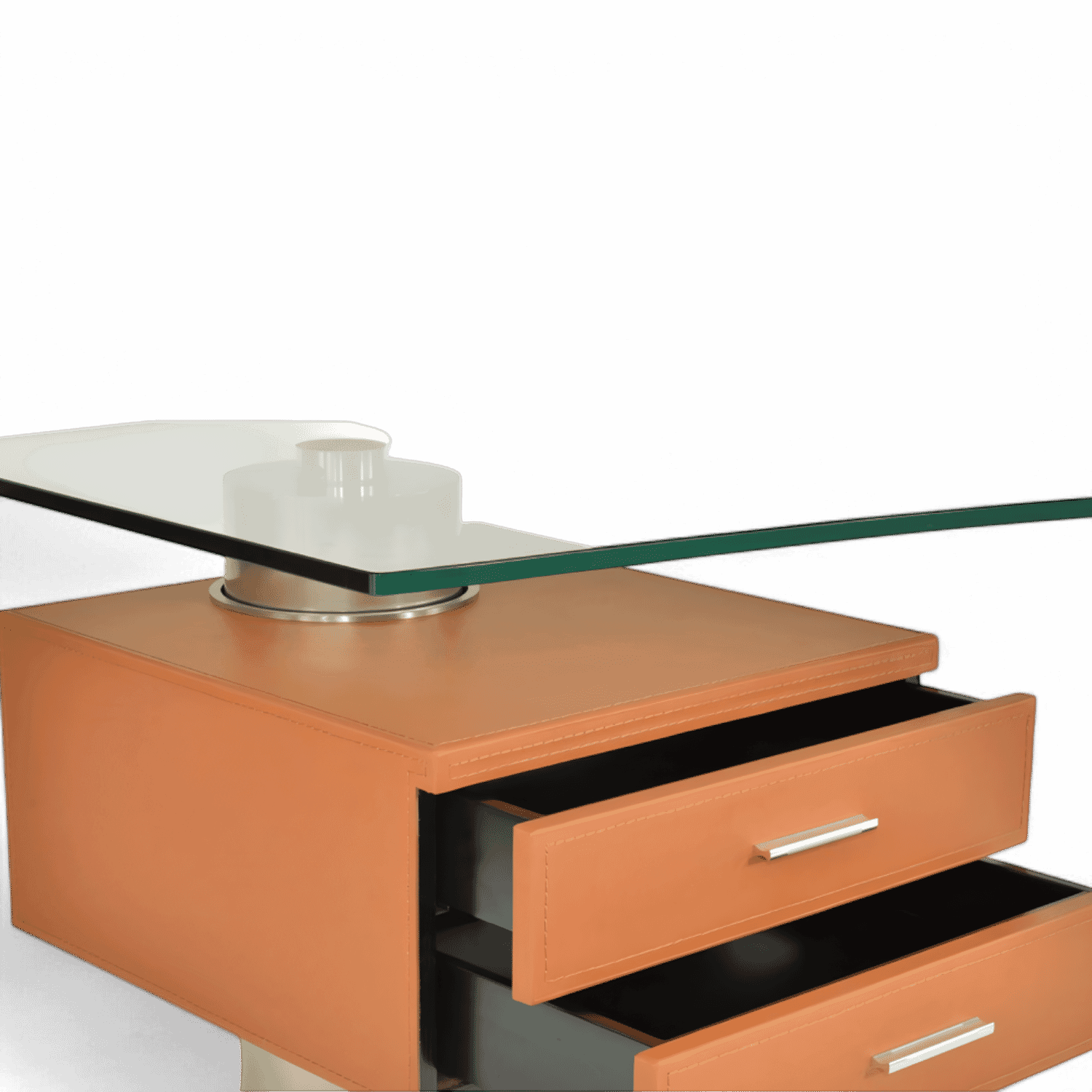 Plateau en verre transparent (non trempé) | Pilier en fer finition nickel satiné | Meuble en cuir régénéré cognac | 2 tiroirs | Capacité : 45 kg