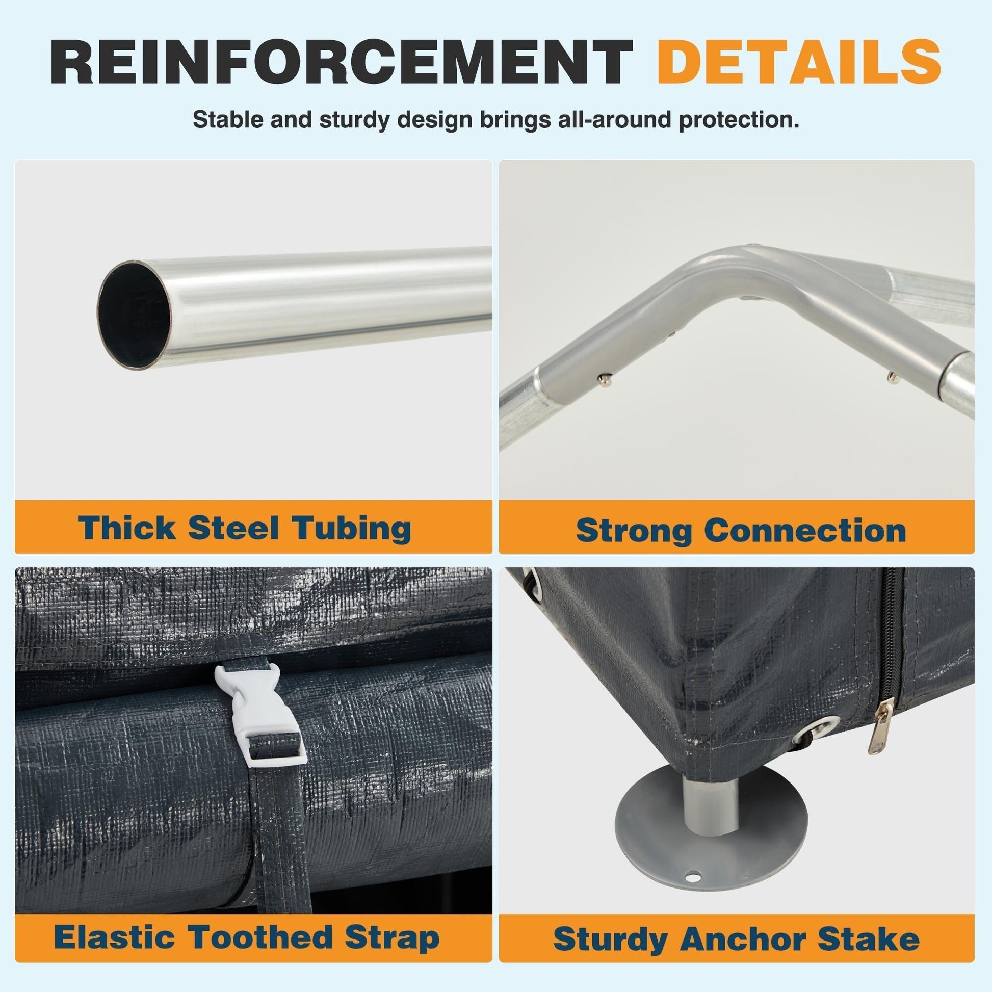 - Protection toutes saisons : La housse avancée, traitée anti-UV et anti-décoloration, anti-âge et anti-moisissure, assure durabilité et protection toute l'année. Elle réfléchit 99 % des rayons UV, est imperméable et résiste aux fortes chutes de neige.
