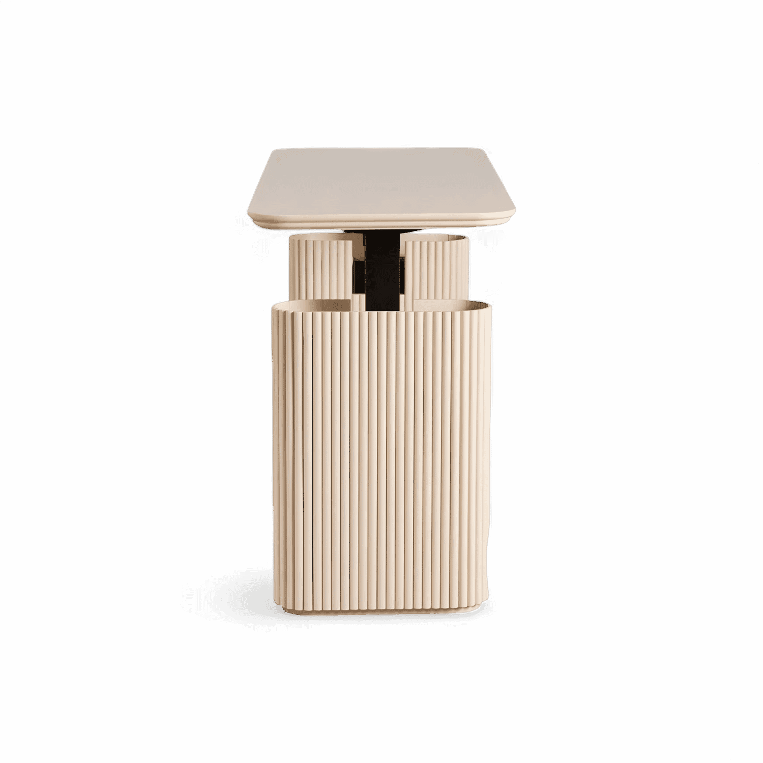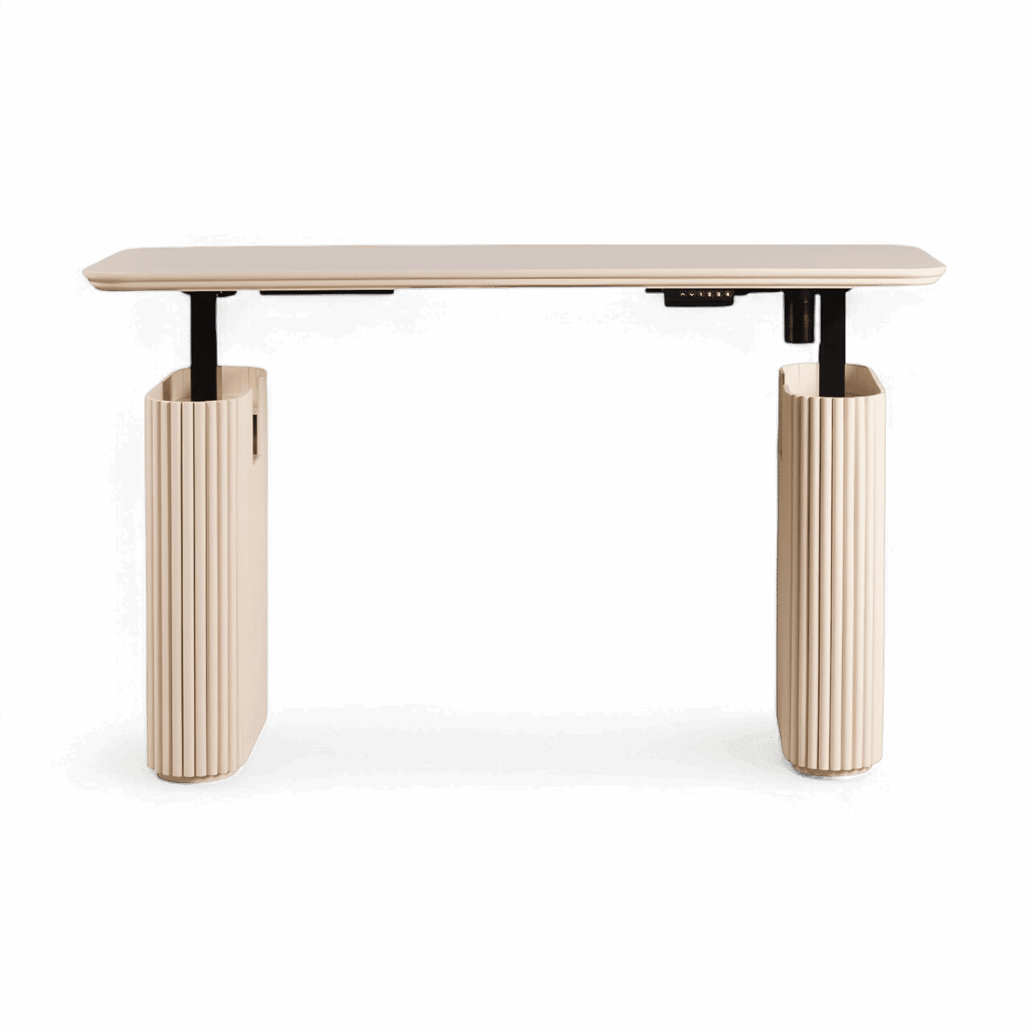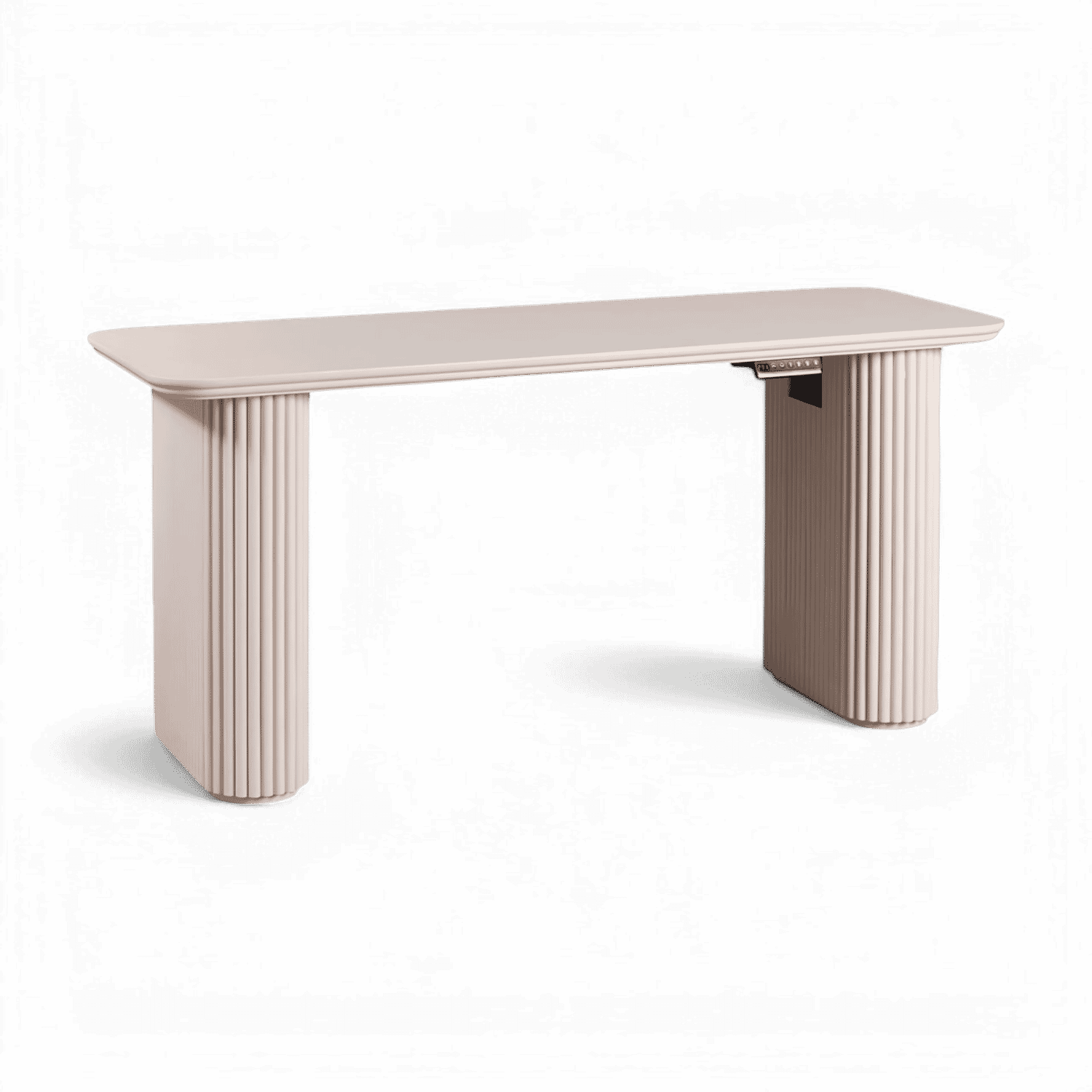 Pour plus de fonctionnalité, le bureau Oxford Alabaster est équipé d'un mécanisme de levage électrique permettant un réglage en hauteur sans effort, garantissant confort et soutien ergonomique, que vous travailliez assis ou debout. Ses pieds gracieusement courbés, ornés d'un remarquable motif de lattes de bois verticales, apportent texture et attrait visuel.