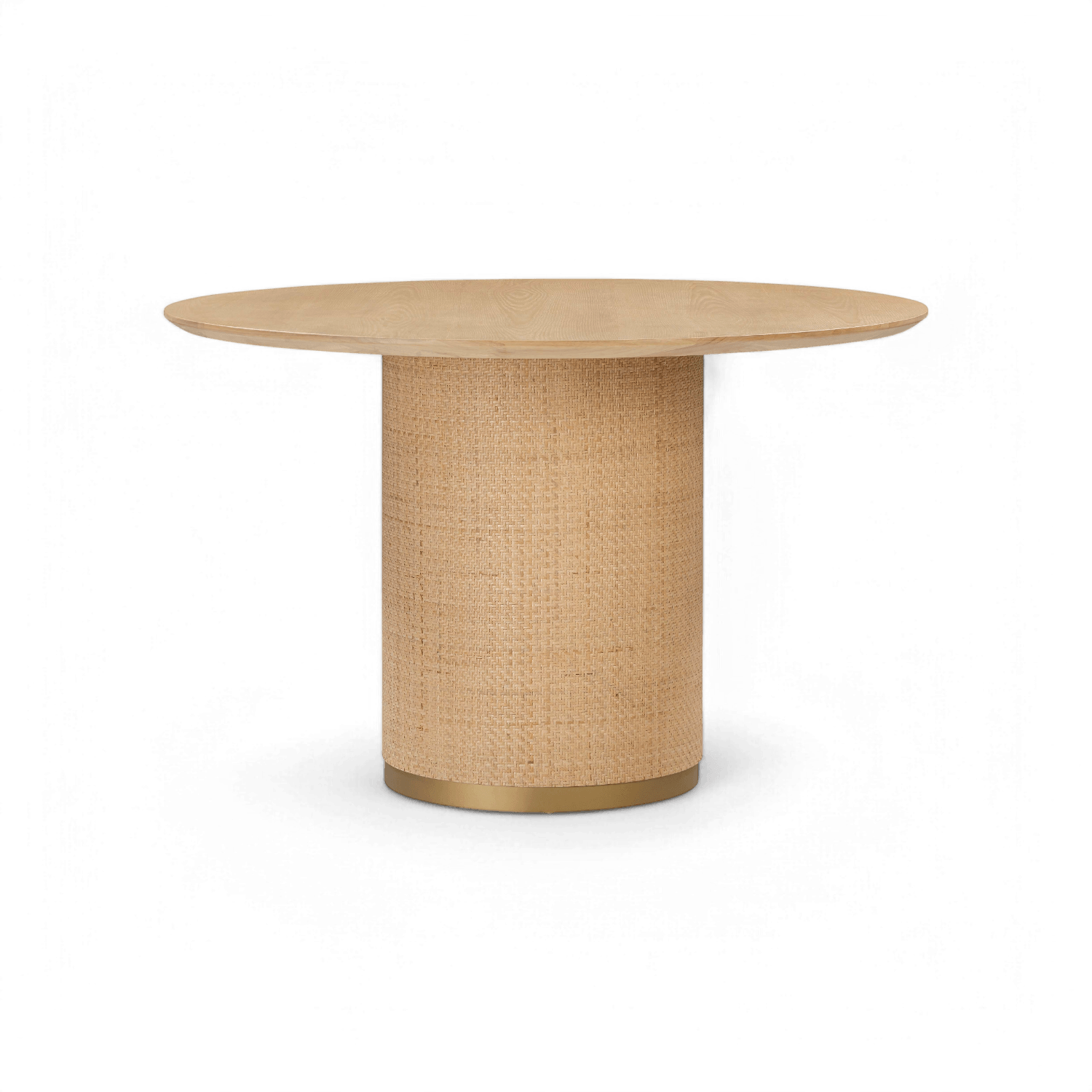 Placage frêne, fer, MDF, pin, rotin | Finition frêne et rotin | Disponible en deux tailles | Capacité : 4 à 6 personnes
