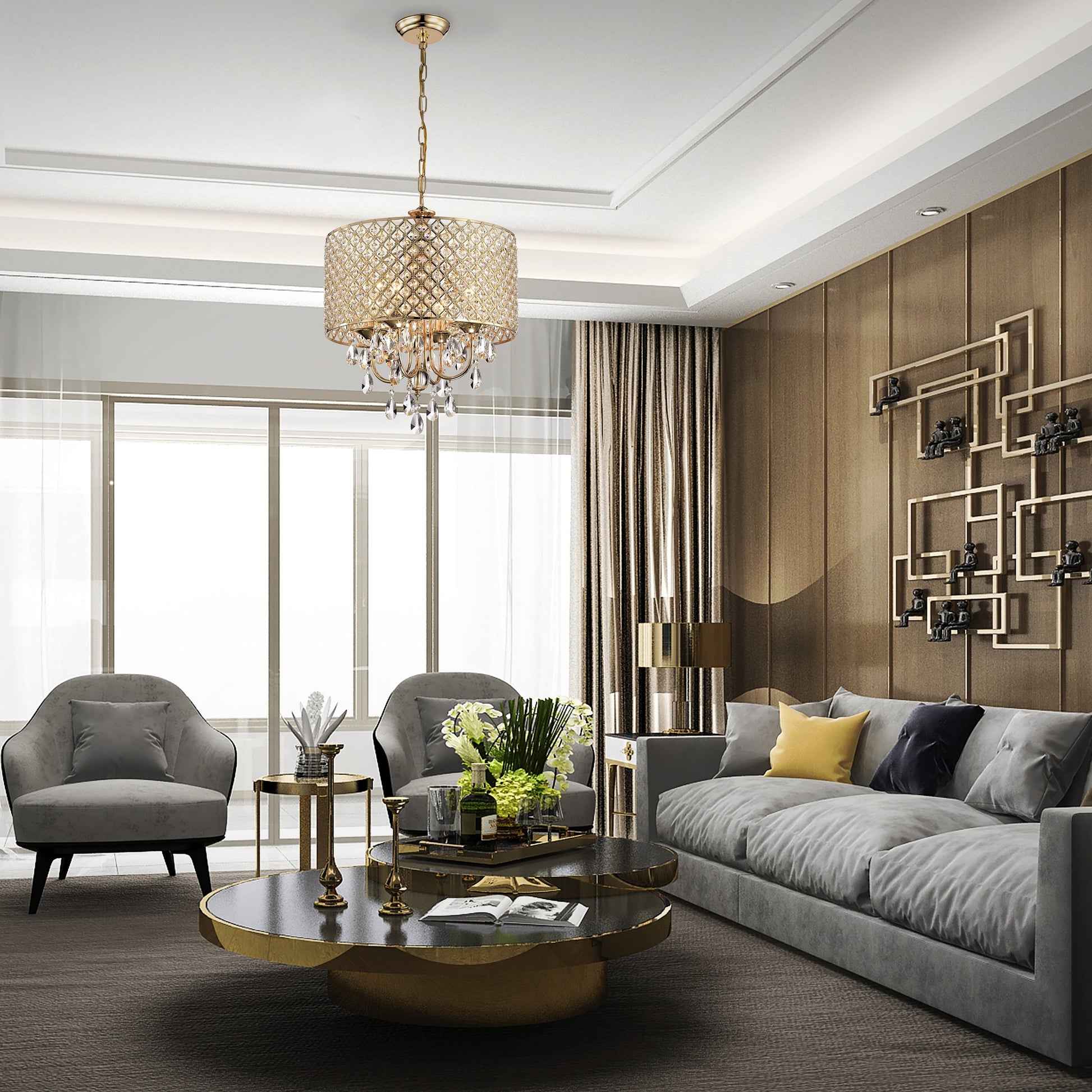 Ajoutez glamour et sophistication à votre espace avec ce lustre tambour rond orné de perles, orné de cristaux en cascade et d'un abat-jour tambour incrusté de cristaux. Son élégante finition dorée apporte une touche luxueuse à n'importe quelle pièce. Disponible en versions quatre et six lumières, ce lustre est doté d'une chaîne réglable de 102 cm, ce qui le rend idéal pour différentes hauteurs de plafond et tailles de pièces. Les lumières orientées vers le haut créent une lumière d'ambiance, créant une ambiance romantique et théâtrale pour chaque occasion.