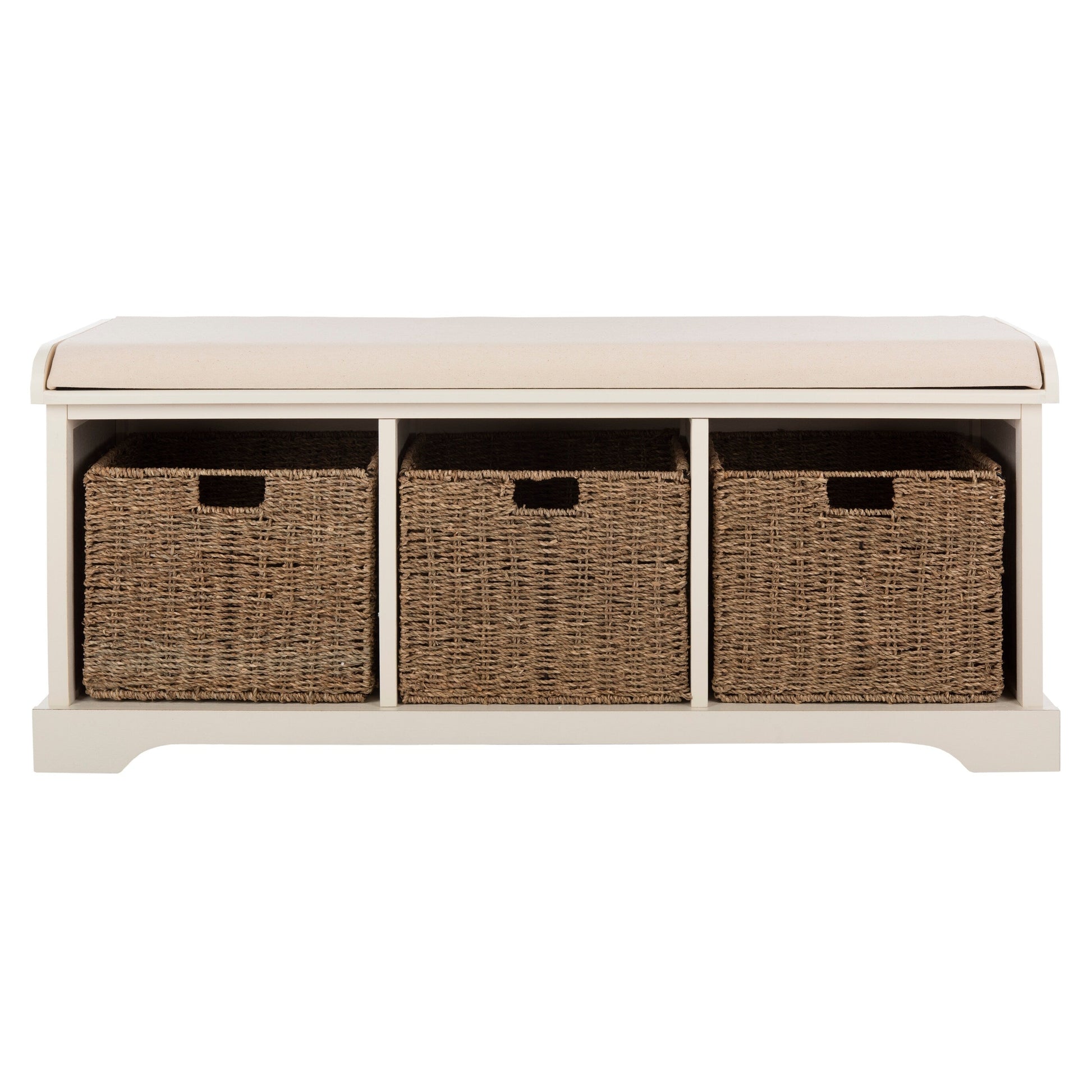 Ce banc de rangement est idéal pour ranger vos bottes dans l'entrée ou vos chaussures de jardin dans le vestiaire. Fabriqué en pin à la finition lisse, ce meuble est doté de trois paniers tressés amovibles pour un rangement facile, et un coussin en coton blanc complète son style avec confort et charme campagnard.
