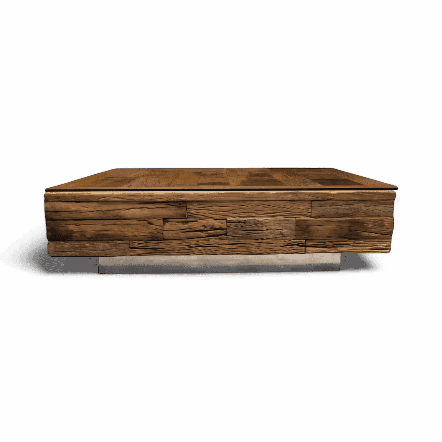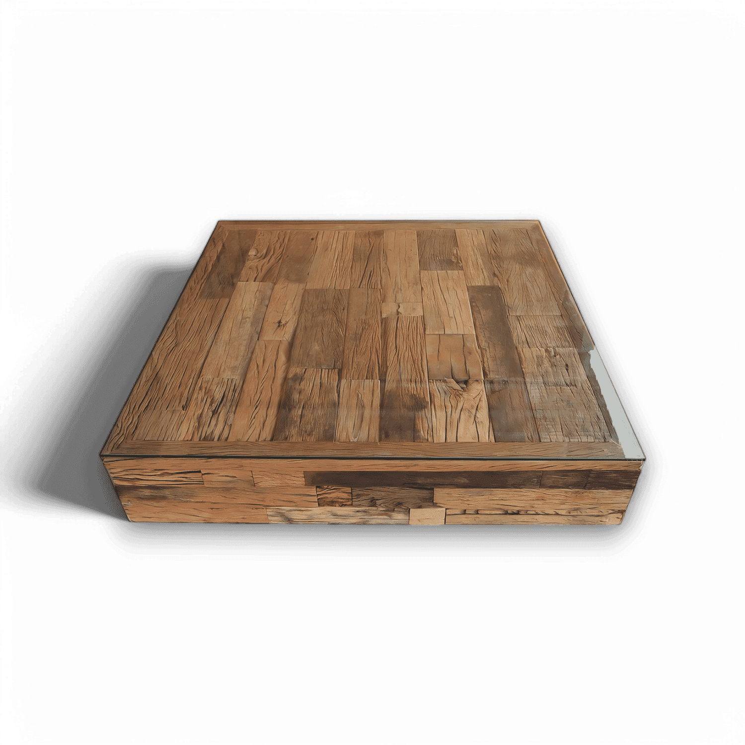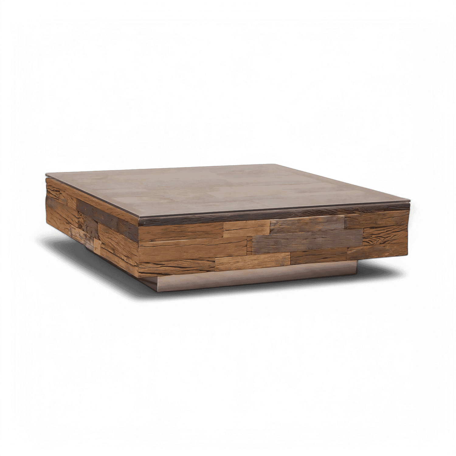 Masse imposante, formant un carré parfait aux angles impeccables de 90 degrés, composée de morceaux de bois de chemin de fer assemblés en une forme captivante, la table basse Samana comble le fossé entre l'industrialisme et la création naturelle. Le verre trempé disposé sur ce support, telle une fenêtre particulière, permet d'observer les craquelures et les veinures qui donnent vie à chaque barre de bois. Les planches de bois sont fixées à un socle en acier poli brillant, donnant l'impression qu'elles flottent au-dessus du sol. Vos invités seront émerveillés par la beauté saisissante de cette pièce.