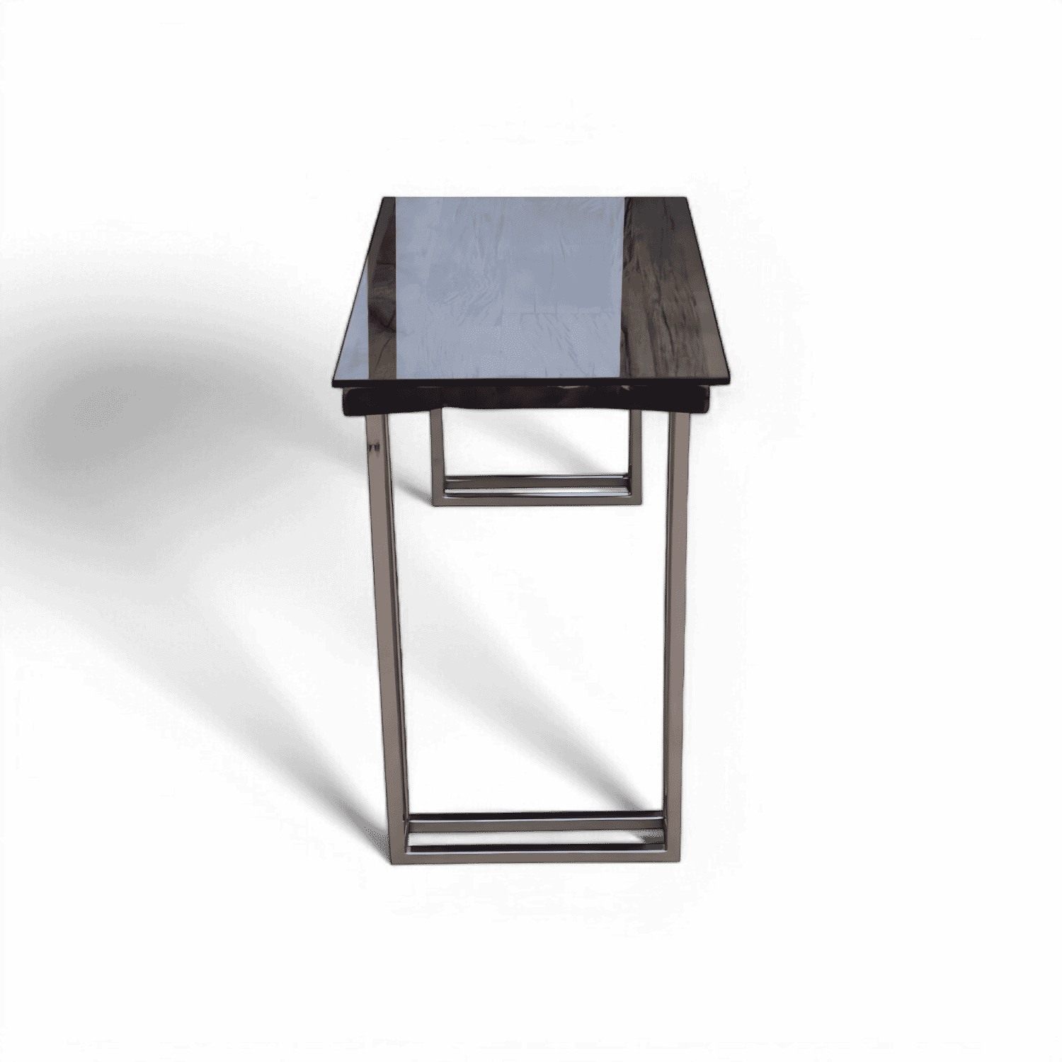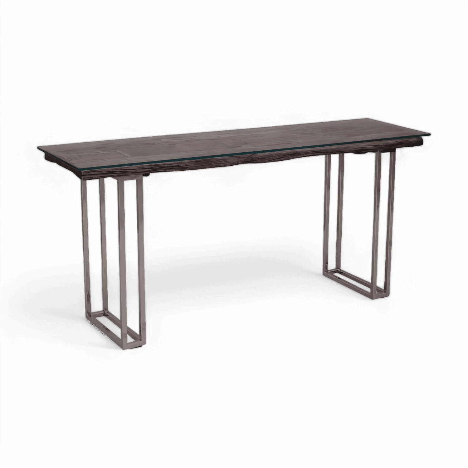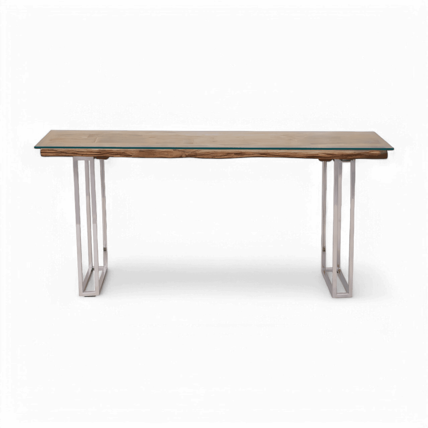 La console Samana allie style rustique et modernité. Le verre trempé sur bois de santal apporte de la texture tout en sublimant les pieds modernes en acier inoxydable. Installez-la dans l'entrée de votre maison pour un style unique.
