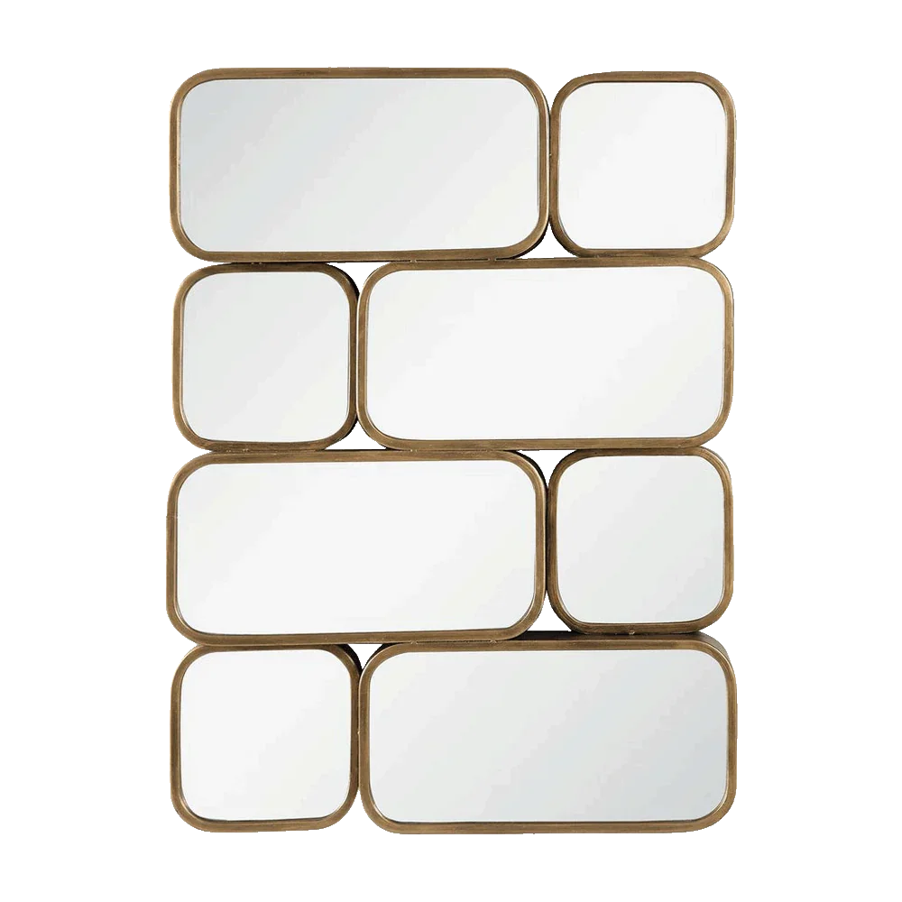 Le miroir Studio doré est une pièce décorative moderne et géométrique. Il présente un agencement unique de miroirs rectangulaires imbriqués, encadrés d'une luxueuse finition dorée. Son design apporte profondeur et élégance à tout espace, reflétant magnifiquement la lumière tout en s'imposant comme une pièce maîtresse dans les intérieurs contemporains.