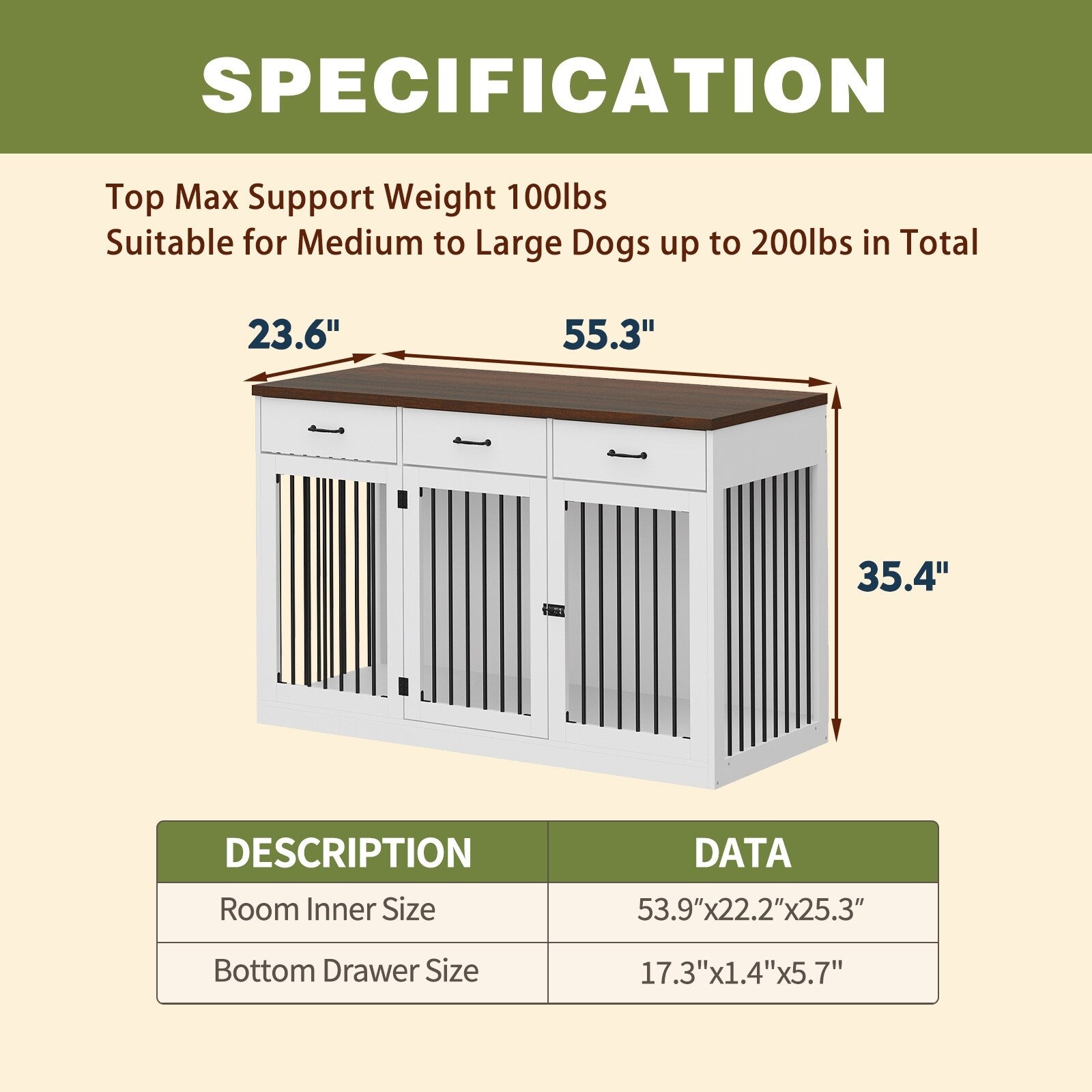 Élégant meuble en bois pour cage à chien avec rangement, 3 tiroirs